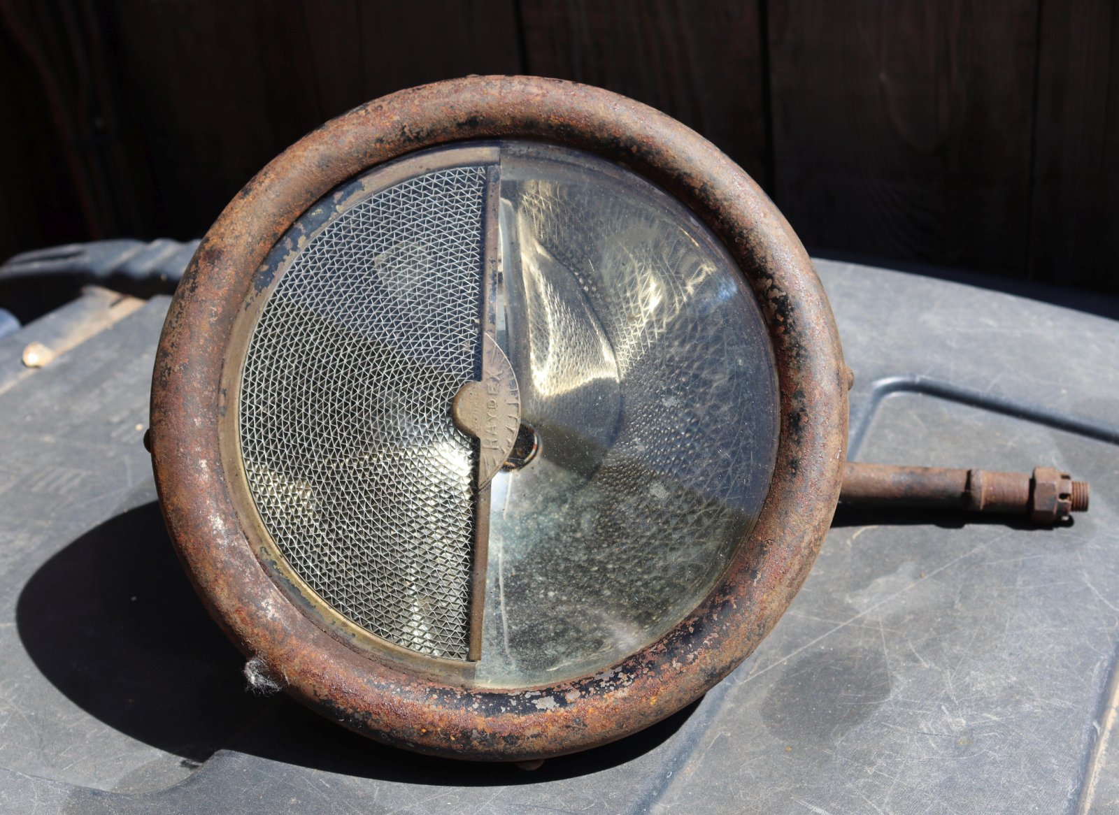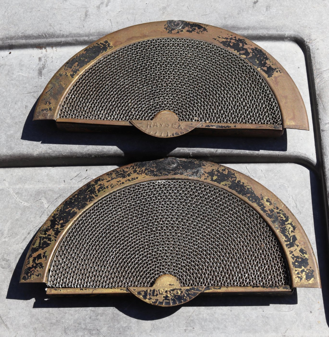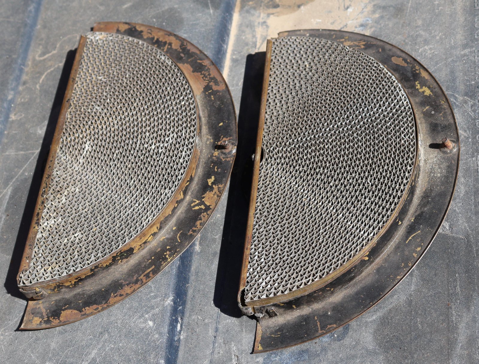 These install inside the headlights between the lens and reflector. I have one installed in a plain glass 1915 headlight in the photos. The frames are brass and the diffuser's are corrugated sheet metal. Asking $35 plus postage SPOKEN FOR!