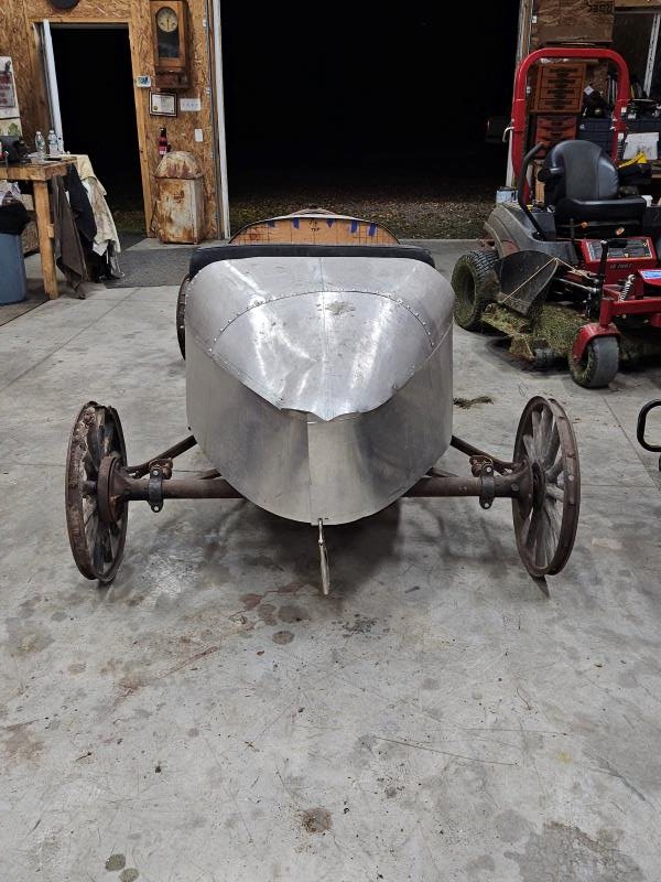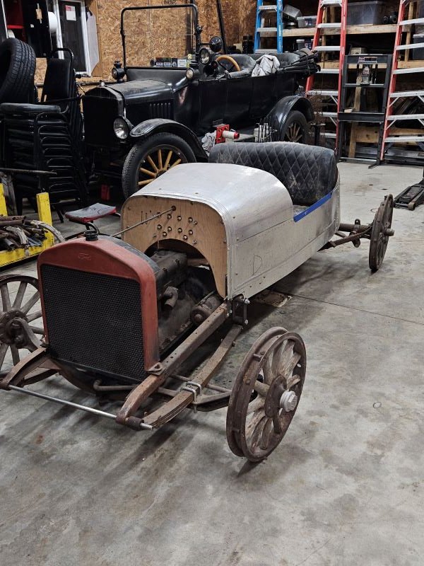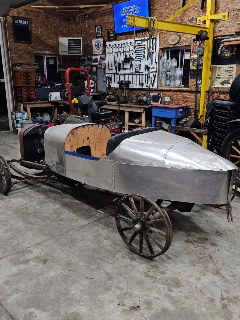 boat tail speedster project. It's on a T frame with T engine (which i know nothing about). The rear was lowered using a Back in the day method and the front end also inspired by a 1920s racecar (Pasco body). The front end is a Essex front end. The guy i bought it from is a professional fabricator and did a nice job with it. Body is hand made with aluminum.