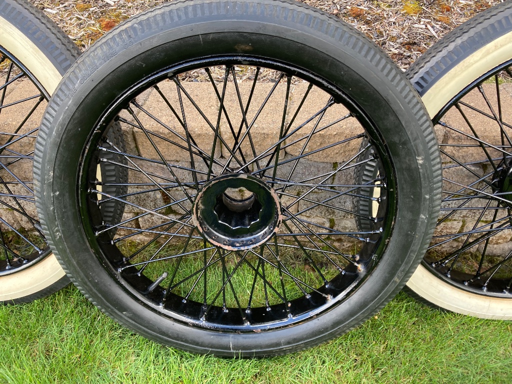This is a nice solid set of wire wheels with Coker white wall tires. 30 x 3-1/2 Tires have never been run. No bent, loose, or missing spokes. There is some pitting on the rims and some flaking paint. Overall a nice set of buffalo wire wheels.