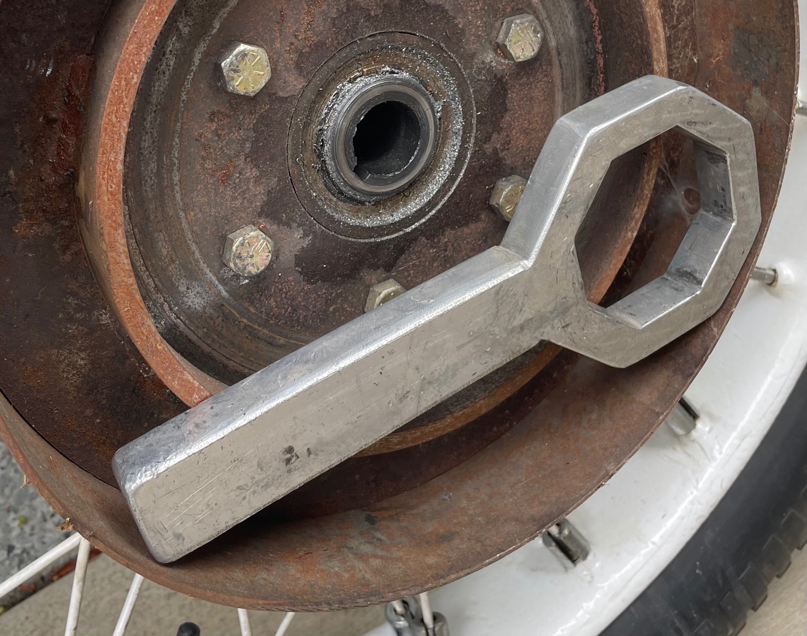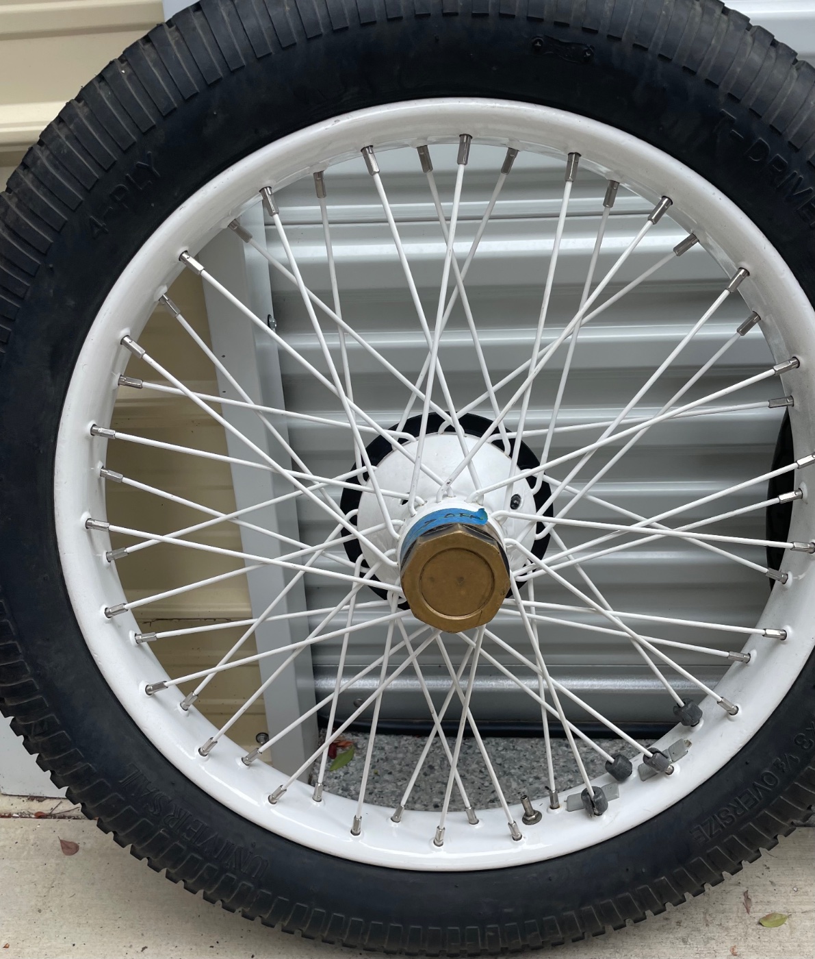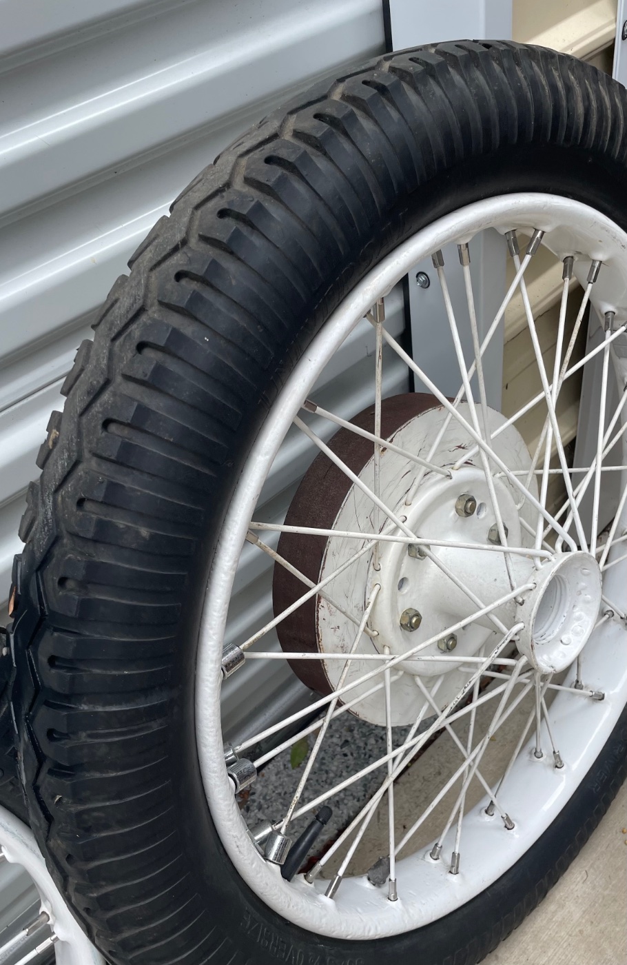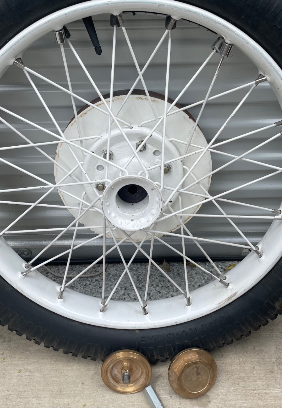 With tires tubes, flaps, Rocky Mountain Brake drums, and Ford drums, and brass knock-off hubs, and hub wrench. No-name brass.
