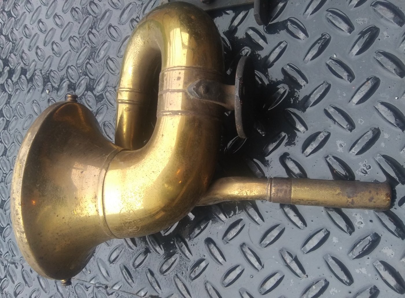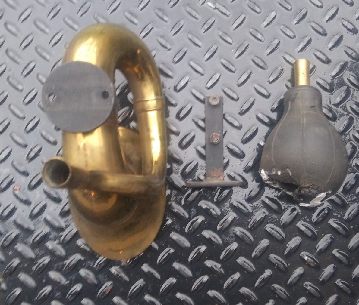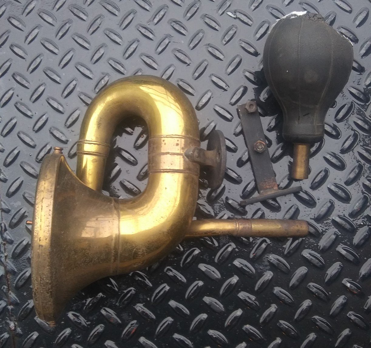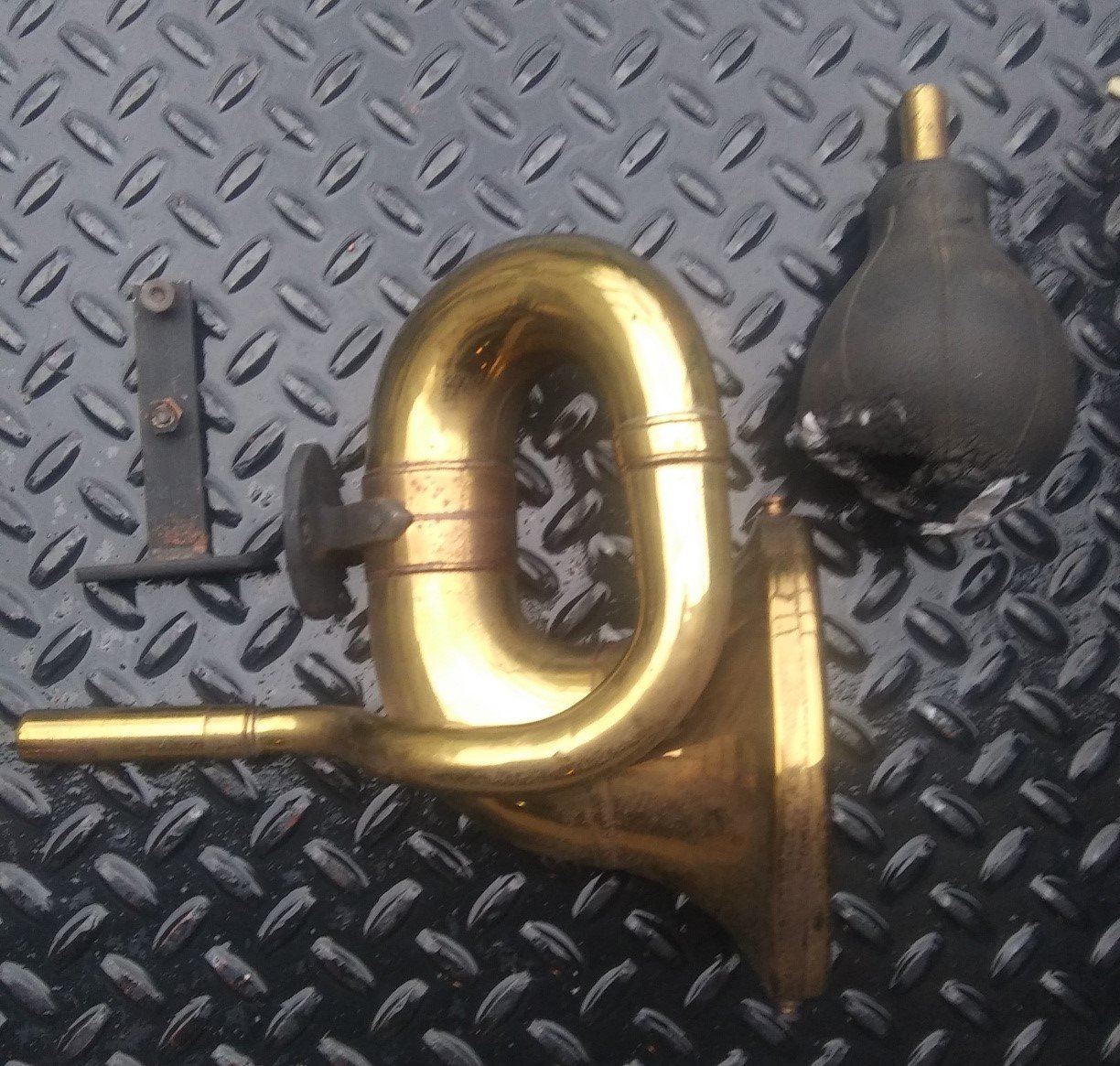Here is a really good original, all brass Rubes horn. Based on the circular mounting bracket, I believe that is for a late 1912 through 1913, but can be used on all years. It has both thumb nuts, a good front screen, an adapter and a rotten rubber bulb but it has a brass ferrule still attached. This one is in really nice condition and has a clear, stamped "Rubes" on it. Take a look at the photos.