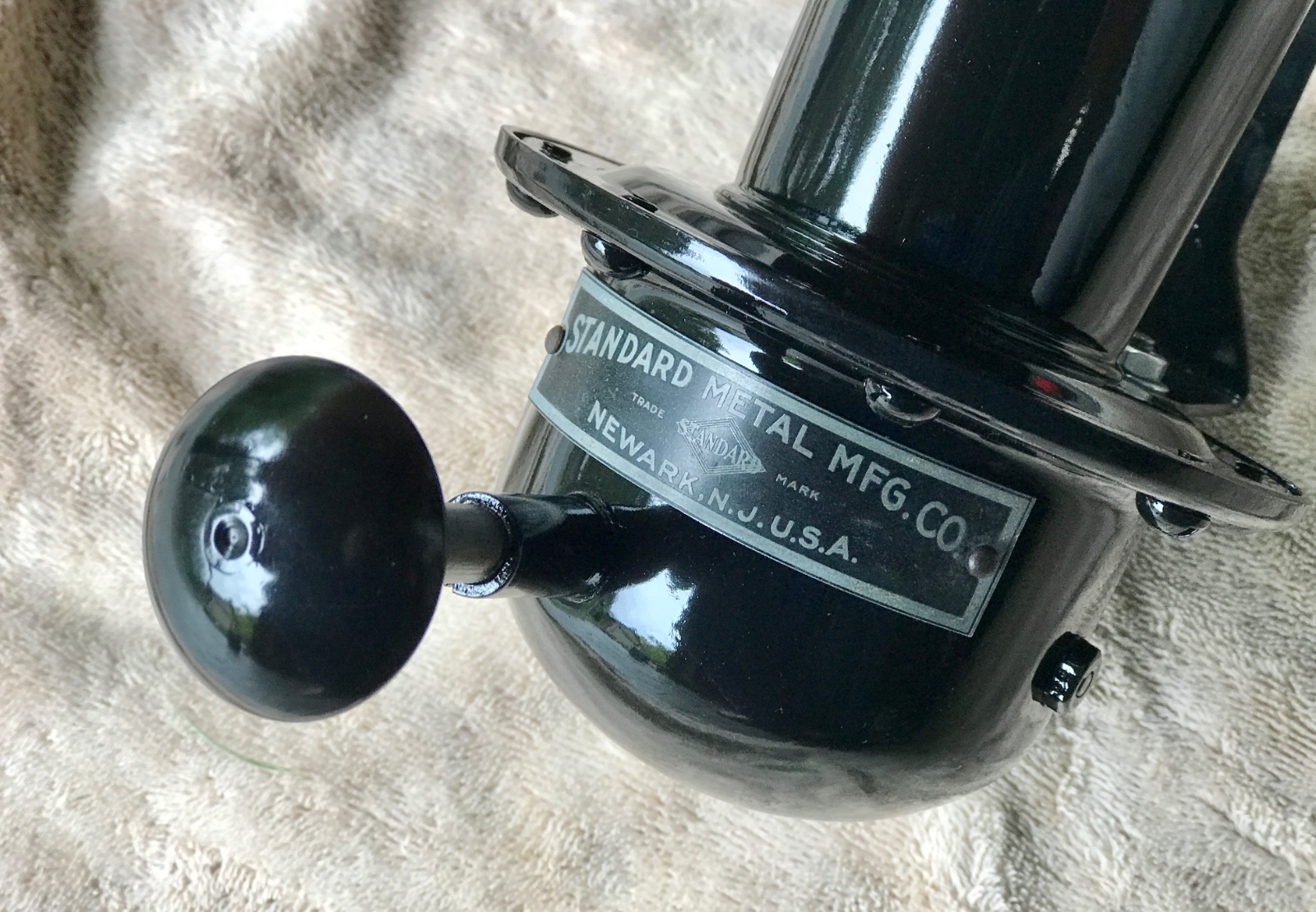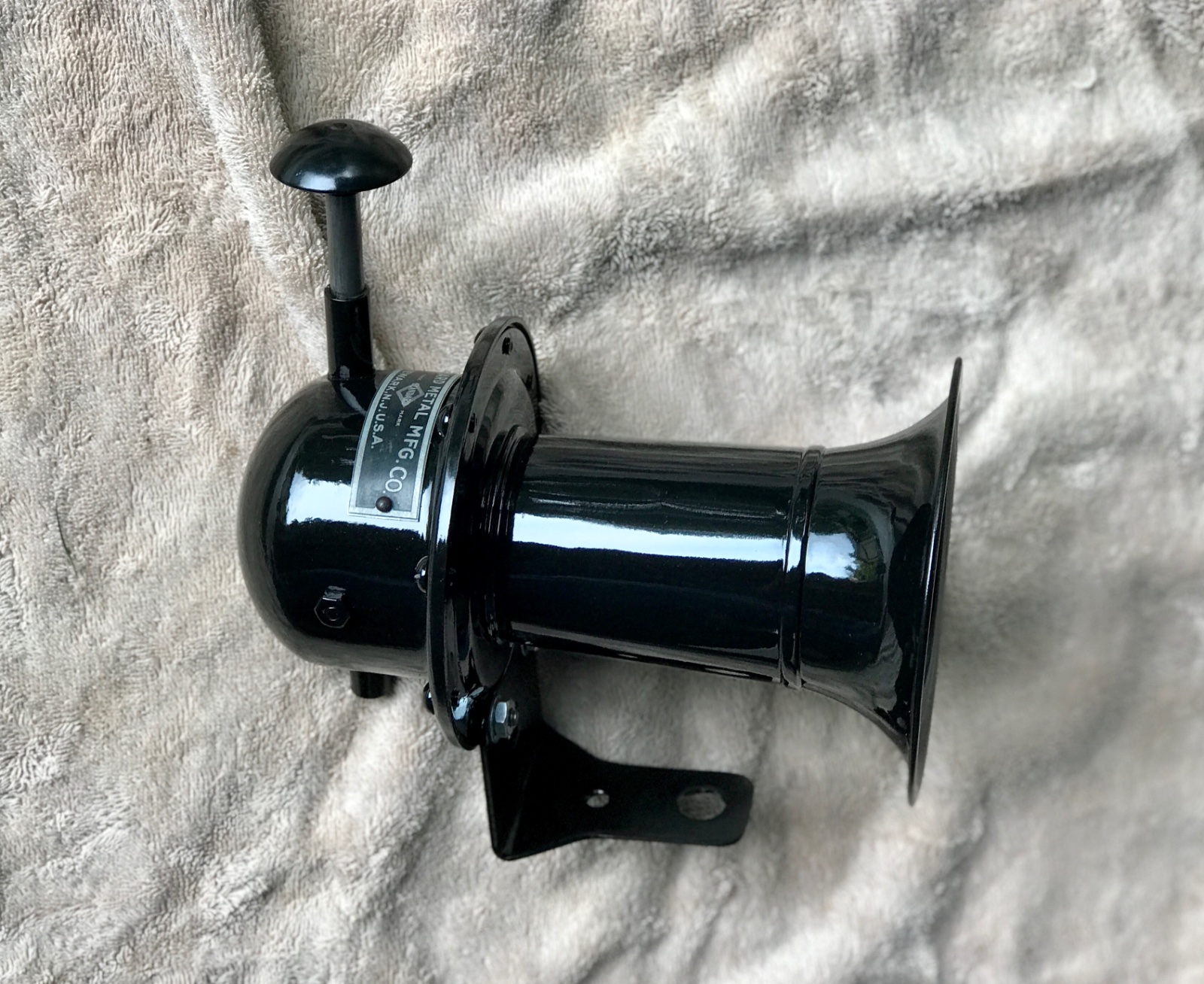Very rare original mechanical hand horn made by the Standard Metal MFG. CO. out of Newark, New Jersey. This horn is very nice and in good working order, and puts out a loud and obnoxious “ AAAWooo!” when the lever is pushed. It has nice paint, with one or two tiny dings or imperfections in the bell if you look real close. 8 inch length and 5 inch bell. Ready to mount and use. 200 includes shipping US