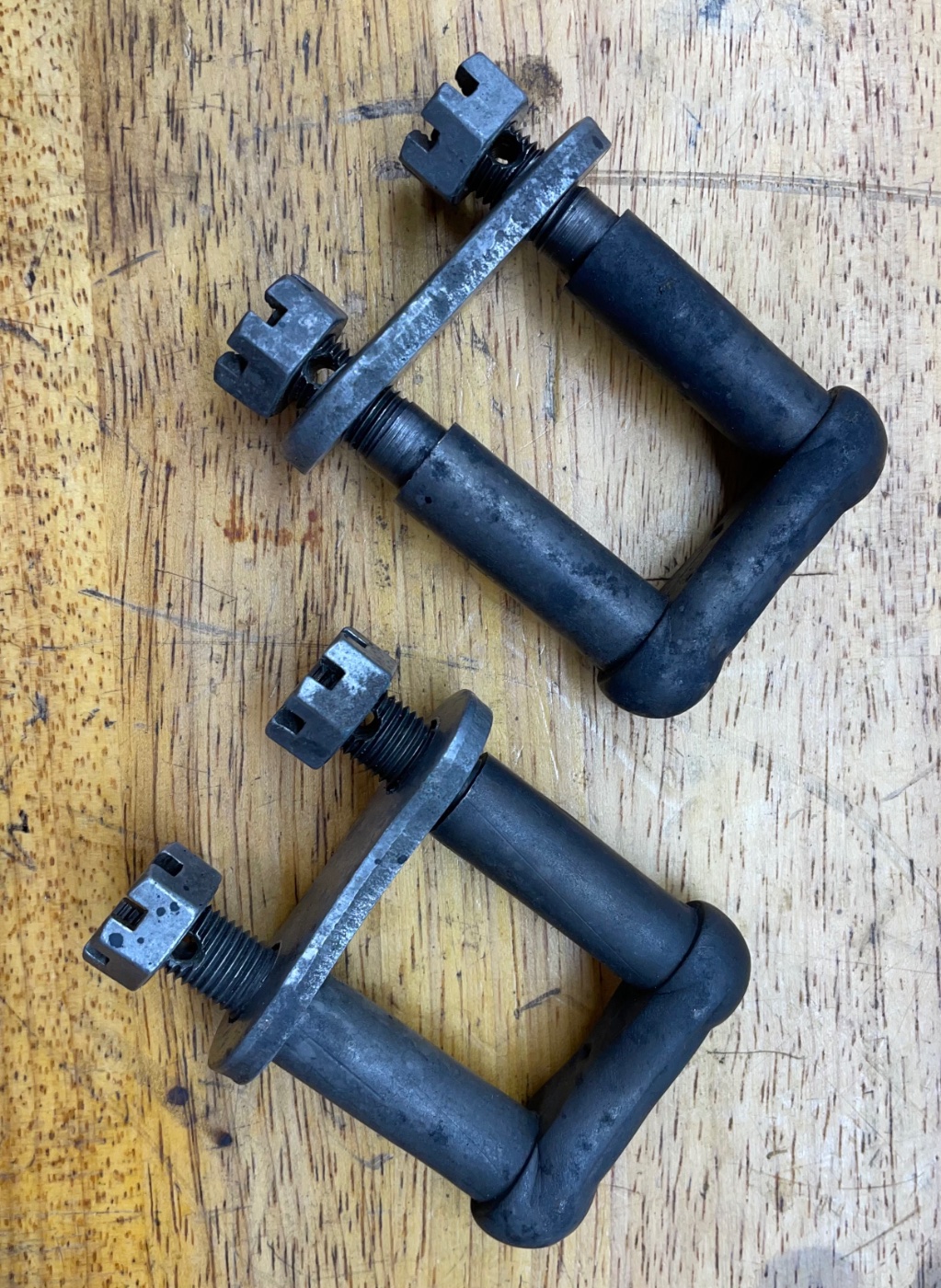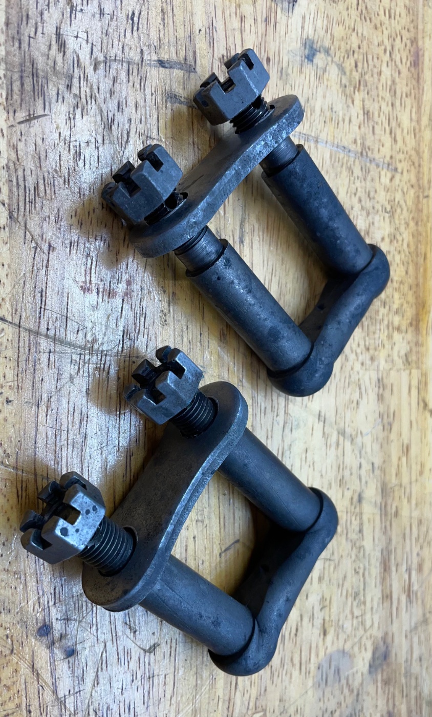 Pair of NOS Elgin Front Shackles for Model T Ford. These are very nice quality and give a nice high ring when tapped, leading me to believe they are forged like original Ford Shackles. Cotter pin holes are parallel with each other.