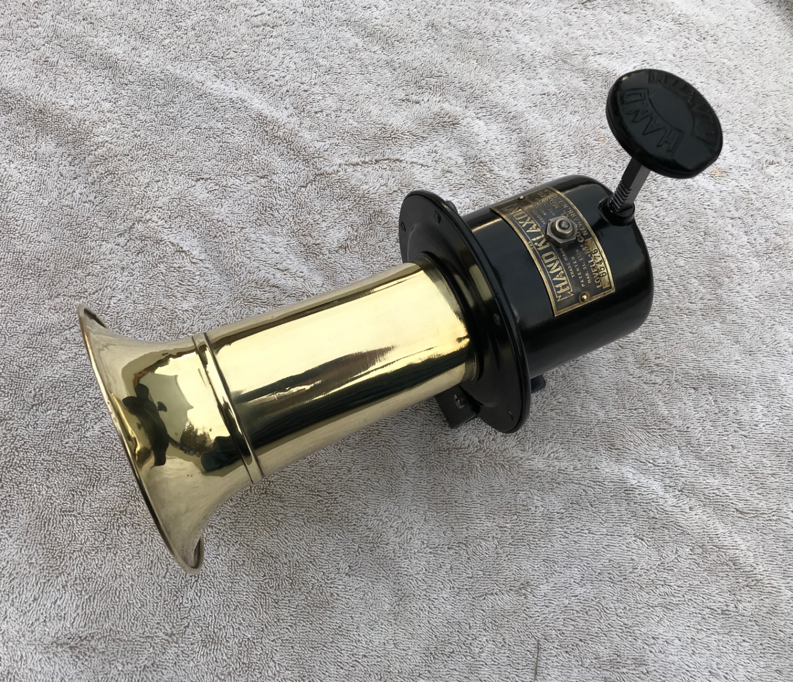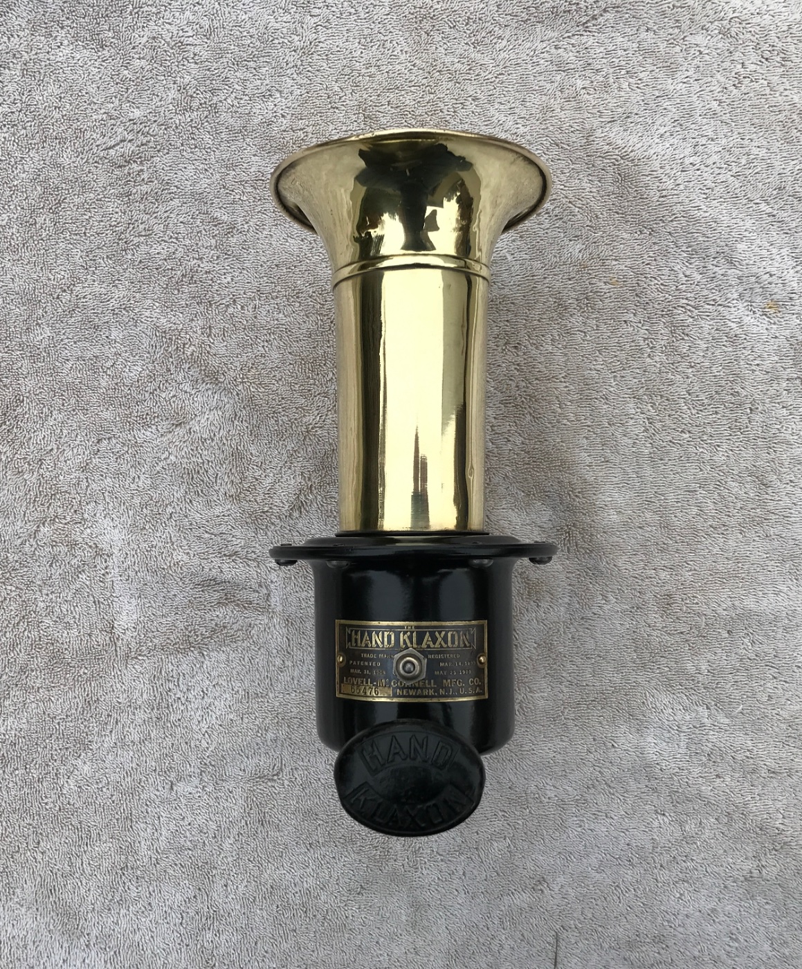 Original early Hand Klaxon manual horn. This horn is in nice working condition, and puts out a loud “Aaaawhooo!” when plunger is depressed. It has nice paint with a polished brass bell. The brass bell has seen some things in its 100 plus years lifetime, and has numerous small dings, bumps and scars here and there on the bell mouth, but still presents well and has a nice look to it. This horn is ready mount and use. Hard to find early brass ones, 275 includes shipping.