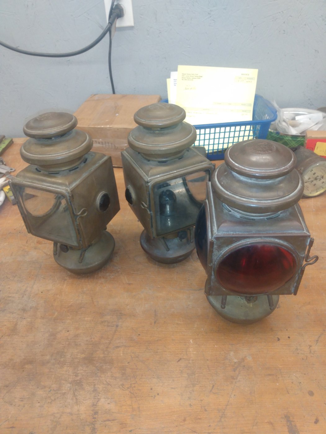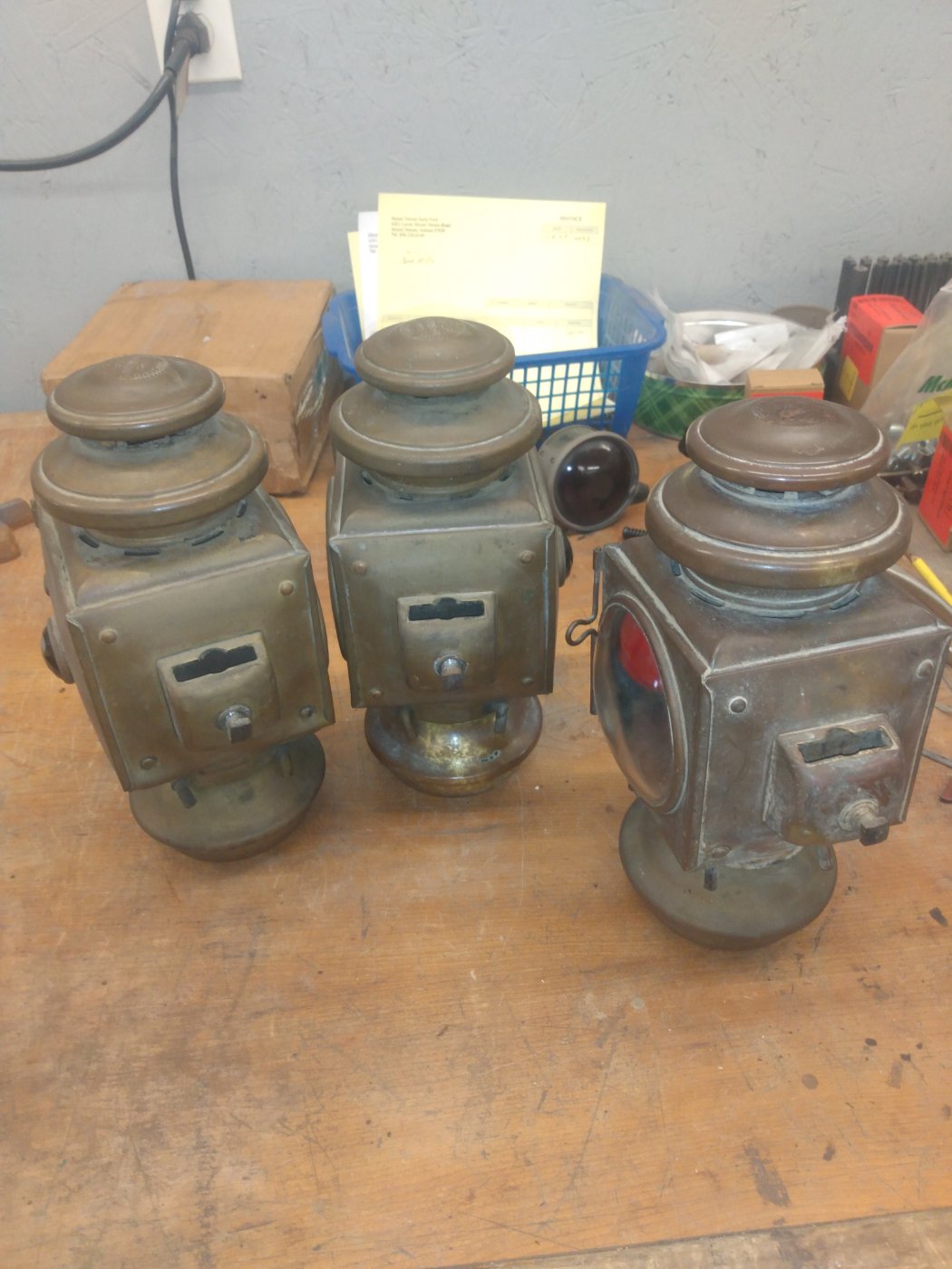 Very presentable set of lights. Taillamp is very nice. Has been pushed down on and has gotten a lean to it. Once hanging it's not noticable. Hinge pin for door is missing has a wire in it. Jeweled sidelamps are also very presentable. One small dink in the top, one of them has been dented in the back. Both sidelamps have the wrong burners in them. Doesn't matter un less you light them, then there might be a problem! An original burner comes with it- damaged. Still a very good deal at 465.00 plus shipping. ctleonard64@gmail.com