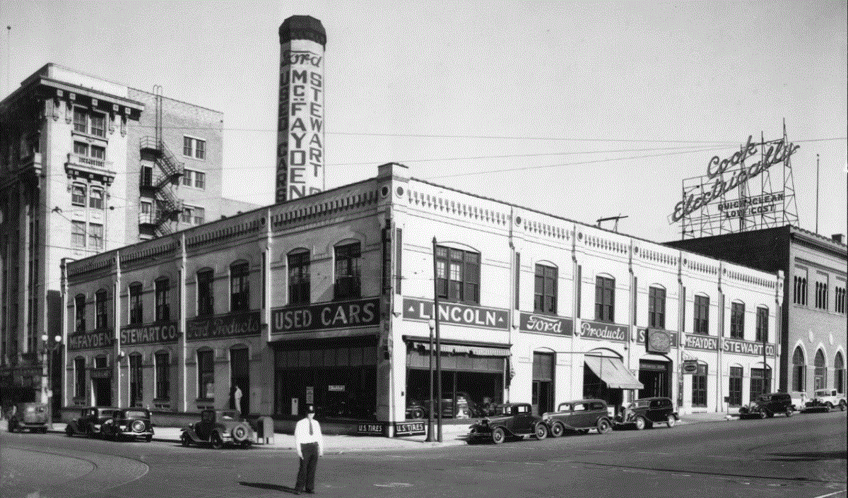 This is the old McFayden Stewart Ford dealership in 1934. Could this be the building where Clyde Manufacturing made the coil tester?