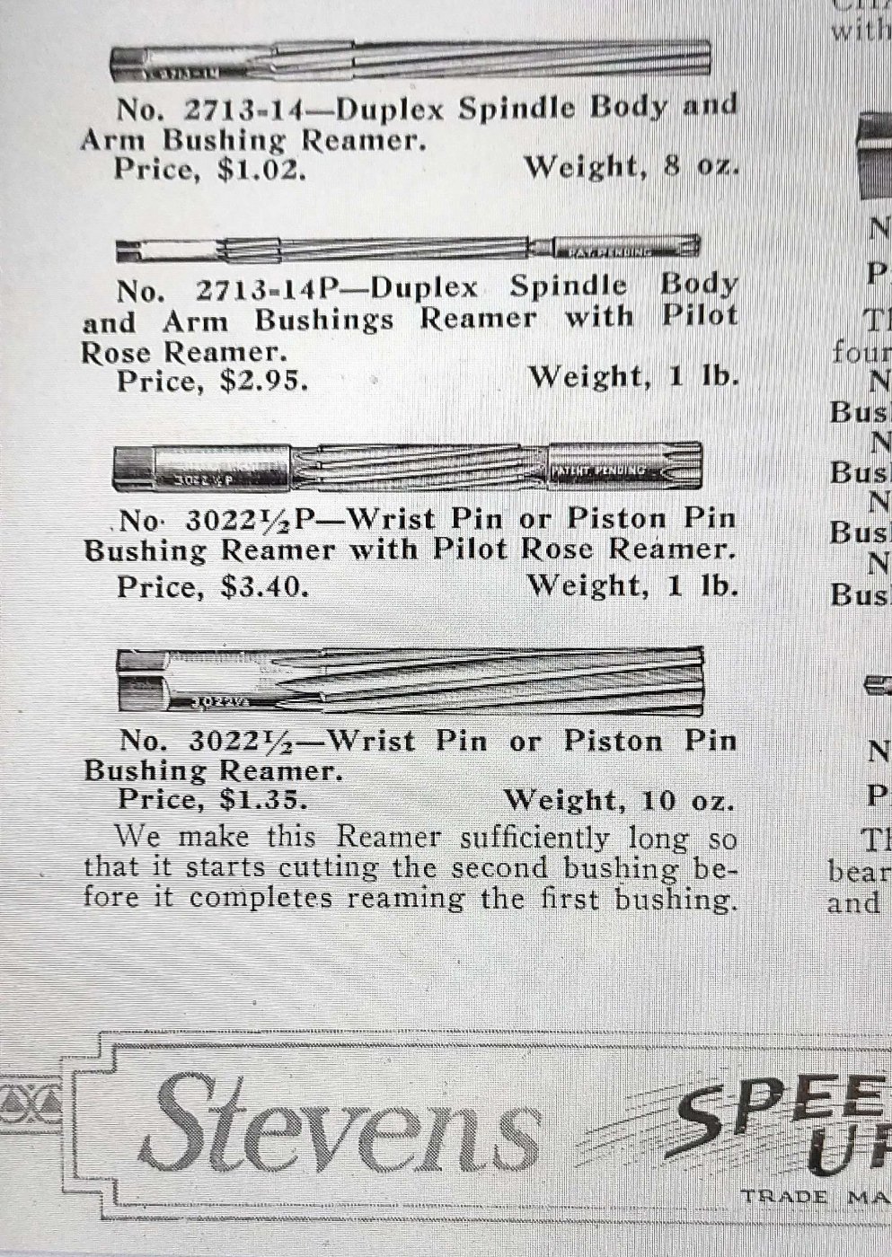 For Sale: Stevens no. 2713-14 Duplex Spindle Body Bushing. This is a reamer for the front axle spindle kingpin bushings and the tie rod bushing. The Stevens reamer number corresponds to the Ford part number for the spindle bushing and the tie rod bushing. Nice usable condition, sharp, no rust, but not perfect: there are dimples on the faces of the square drive so I suspect someone used this by clamping the flats in the jaws of a vice instead of using a tap handle, although it is still good to use with a tap handle. PRICE REDUCED TO $75 plus $10.20 USPS flat rate priority mail within USA.