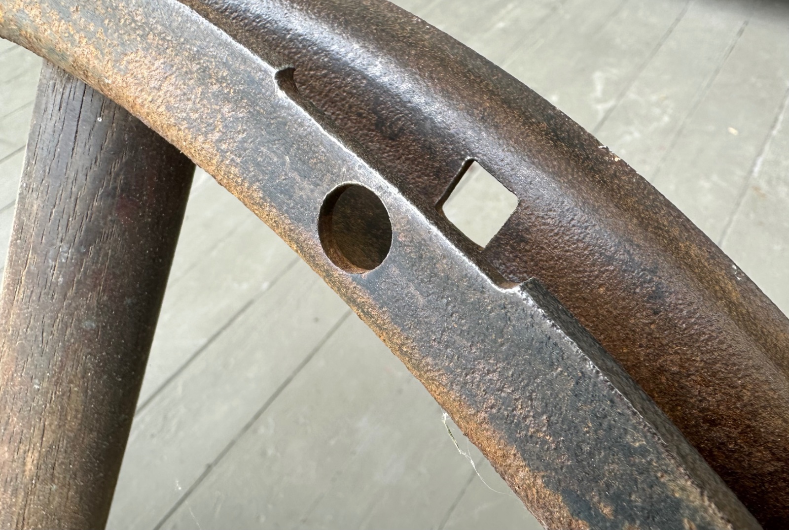 I had another thought when examining this felloe, "what if it is a Chevy felloe and the valve stem hole doesn't line up with a Ford or Hayes or Kelsey rim? So, I took one of my modern aftermarket Hayes style rims (from Australia) and placed it on the felloe. Luckily, the valve stem holes line up correctly, see pics.