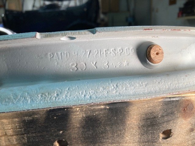 Allan, I took a closer look at the wheels I am working on. I found markings on one of the rear wheels. While all four of them are the same, only the one rear was marked. I think its a Firestone marking. Paraphrasing from the CD version of the Encyclopedia, Wheel section, page 2 ...when Ford began making wheels, made by Firestone, all of the other brands including Hayes and Kelsey became interchangeable. Still doesn't get us any closer to finding a Hayes marked wheel but I learned a little more today.