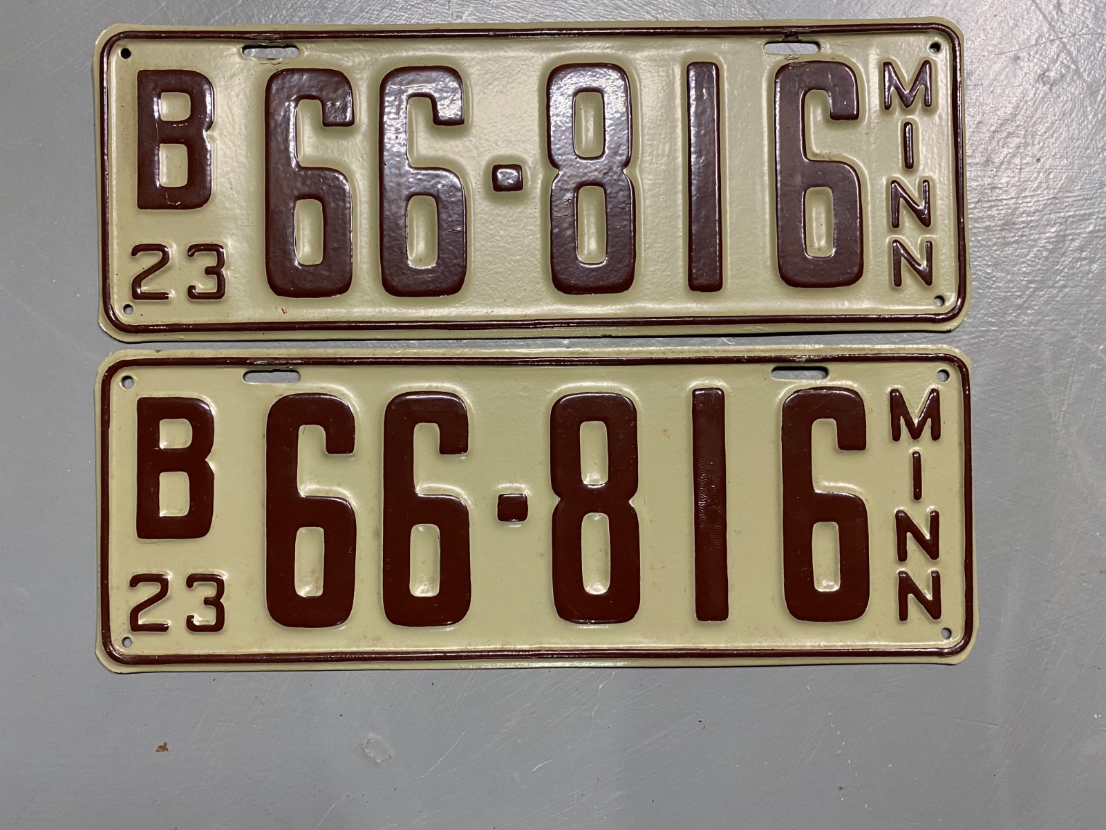 One pair of 1923 MN license plates, nearly perfect, $50.