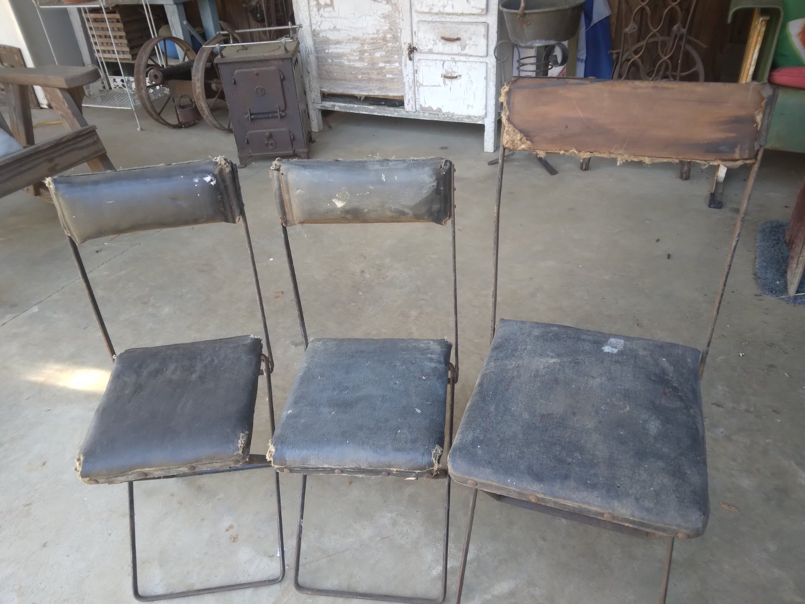 The tall chair is missing the backrest padding. The wood and metal are excellent on all three chairs. They will restore very easily or replace the missing leather backrest cushion with old leather and use as original survivors.