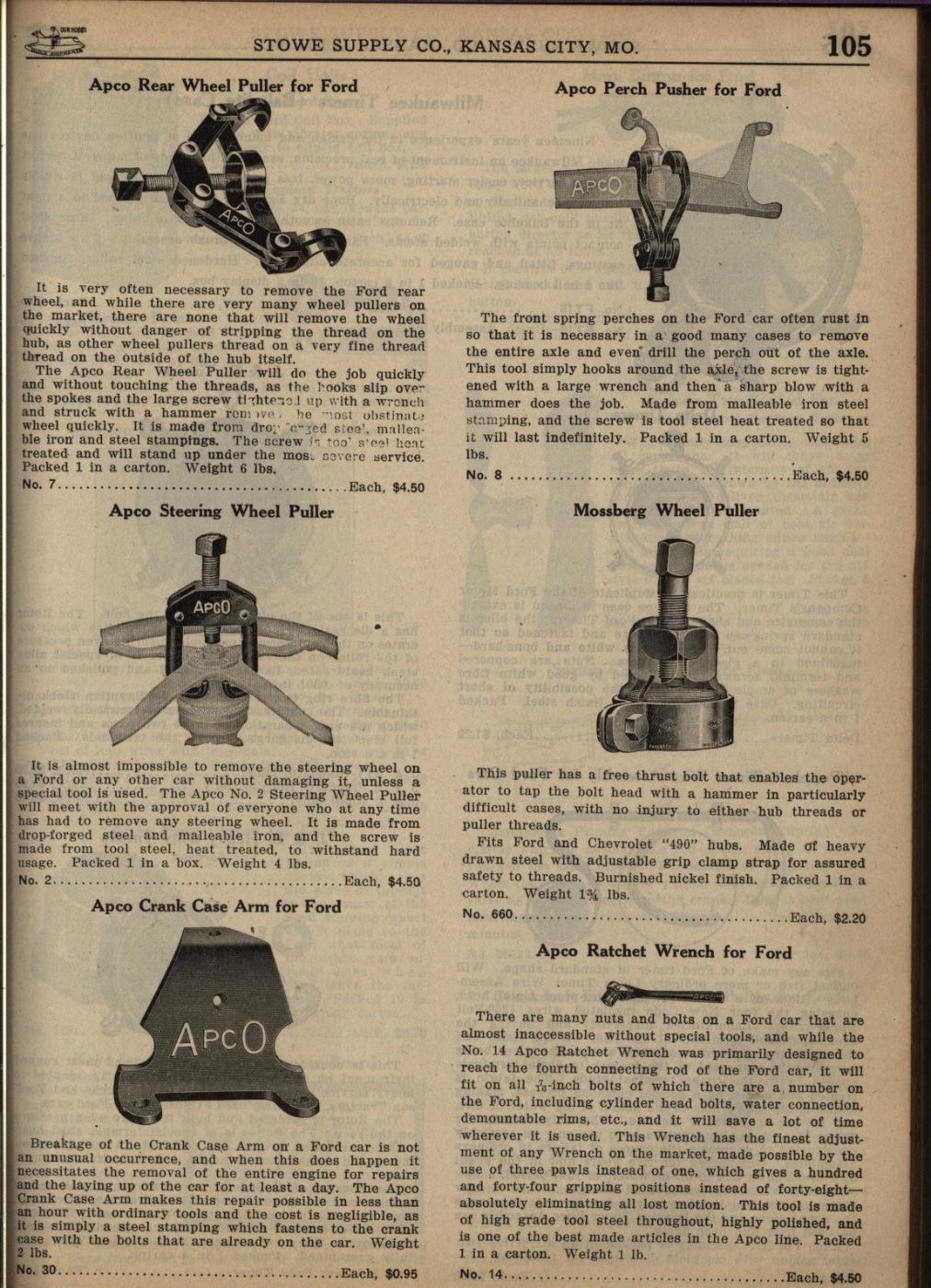 I don’t recall disagreeing. I agree that your puller is a perch pusher - either a factory variant of the more common styles or a modified steering wheel puller. I actually lean more toward factory variant. 437 is definitely not the tool number though. It is on steering wheel, perch, and I believe hub pullers, too. The catalog page I posted above shows the tool numbers, which are the same numbers used in other ads from the mid-teens and twenties.