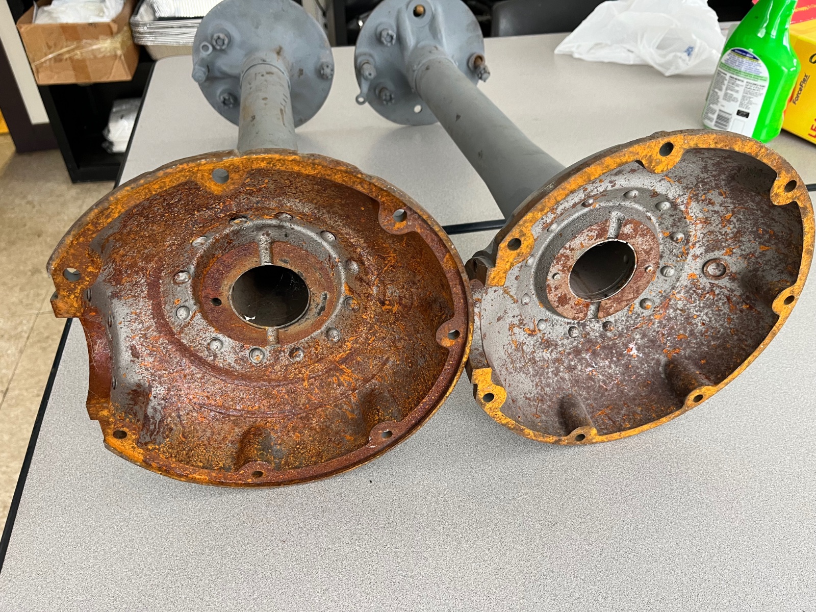 I have one of these axles that I have not opened up yet and I would like to identify the year of it. Mine has two ribs on each end. On yours, the backing plates are different. One appears to have six holes and ribs and the other is plain and has five holes. Can you give me any insight as to the difference?