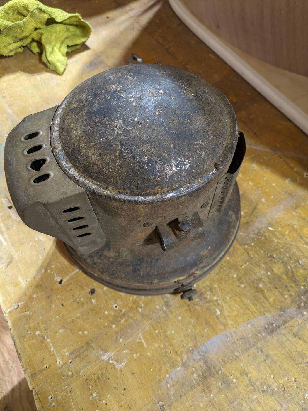 The bucket and brass bonnet in good condition. The brass rim has some wavy ness in the hinge area and the reflector is cracked.. asking $125.00.plus shipping..