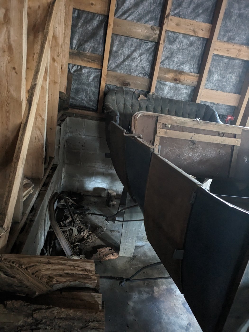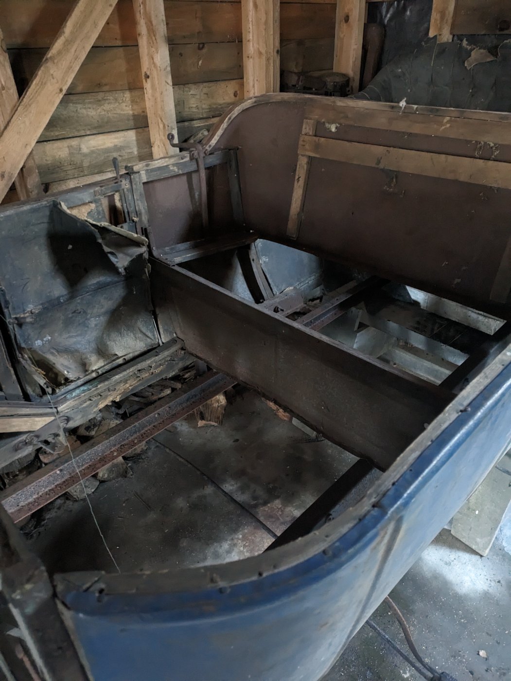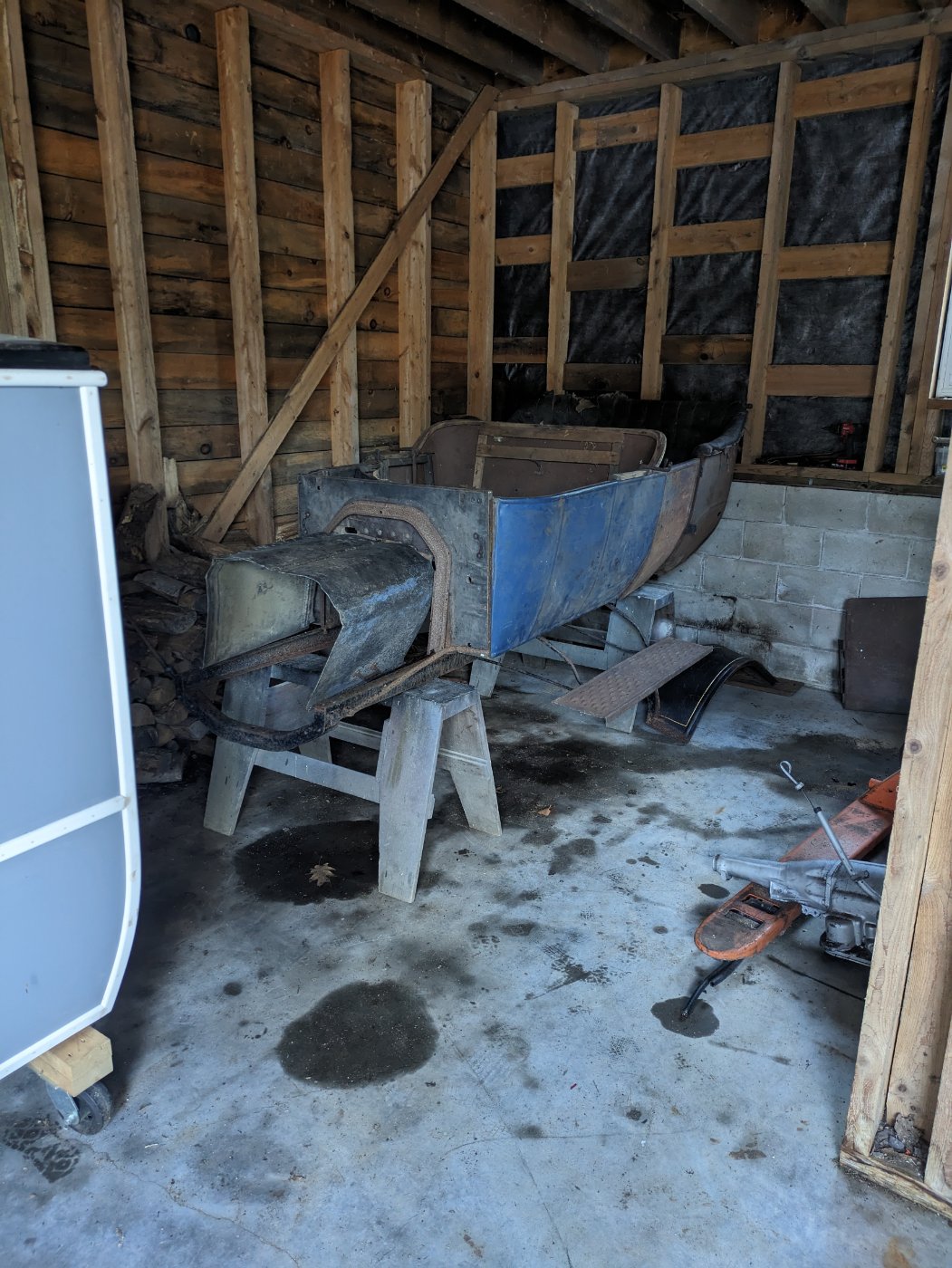 Found under the stairs in an old farm house here in Maine.. metal is in good condition only light surface rust.. the body wood is good. The body rail will need to be repaired.. it was made into a truck some time ago.. the rear doors and seat still have the original upholstery.. the body isn't beat up pings and dings.. nice metal. Sits up on a 14 - 20 frame with vast running board brackets. Has all the body brackets for the top.. has a hood and hood former ( fair condition )... Pair of running board on good condition.. has all door latches and still are working.. and a pair of rear fenders..has a pair of firewall brackets as well...pm me or call for more info.. located in southern Maine.. asking $2100.00..