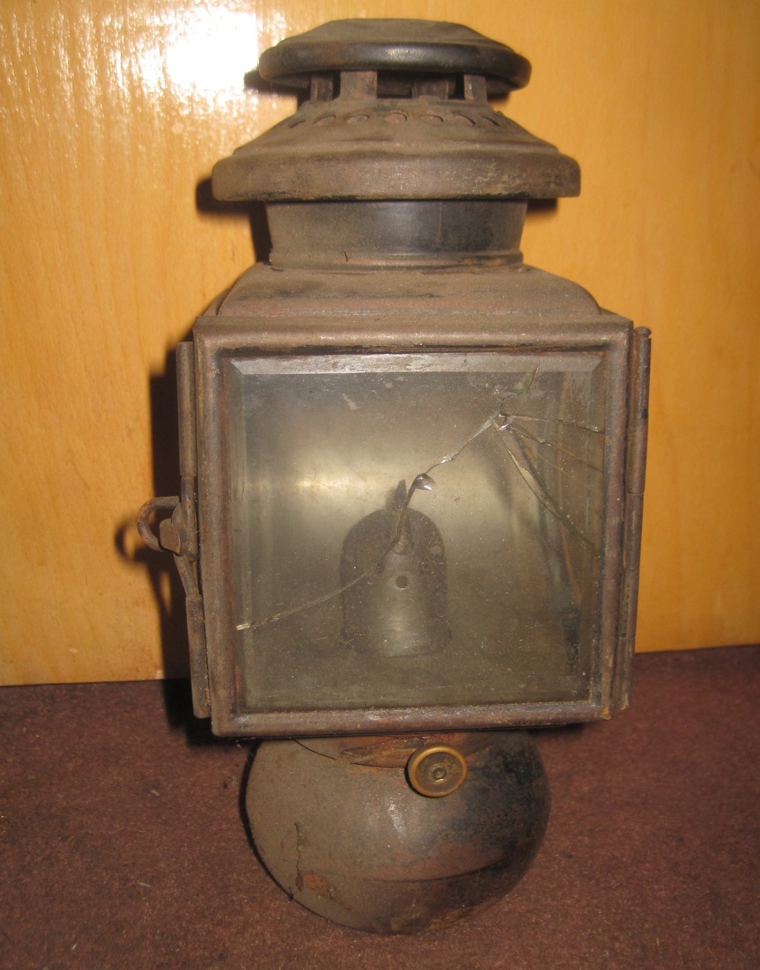 FS: A decent, restorable E&J Model 32 "Black & Brass" Side Light, Right Hand Side, with Fount and Burner. I'm guessing this dates from mid to late 1914. All steel except for the top. This is the earlier version that does not have the mounting brackets riveted directly to the lamp. This light is quite nice, there are a few dents in the top and the door glass is broke, but everything else looks pretty good. The fount and burner are unique to E & J #32 lamps. I don't have the mate for this light. Asking $85 not including shipping.