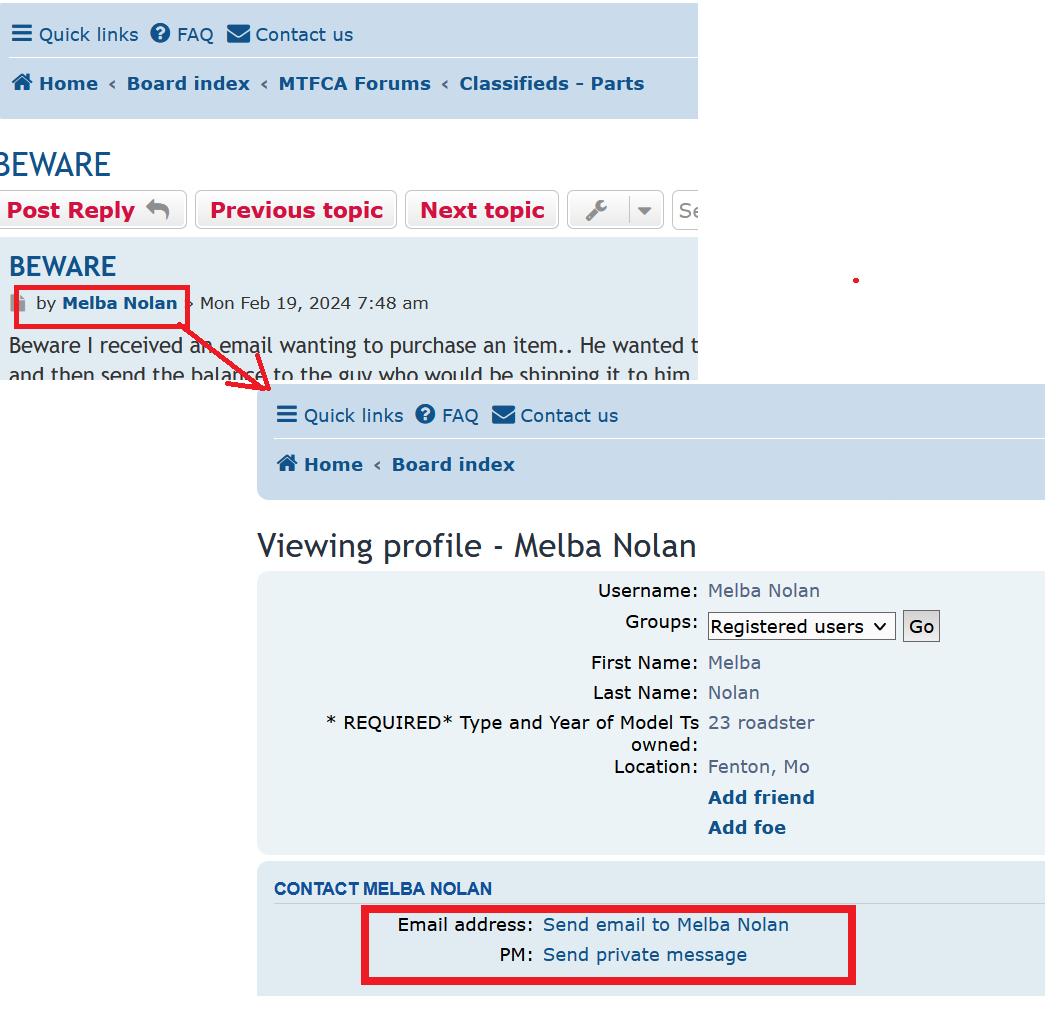 Just about every WTB ad I place on any site generates scam responses. Usually they start with " Contact so and so at blah blah auto parts he has what you want". Then they provide pictures that when I do a Google search on are from other sellers on the internet. It just happened last week when I posted wanting to buy some Model A running board aprons. When I told the guy they were pictures off of the net and he was a scammer he sent more pictures of splash aprons he "had". Some pictures had snow on the ground and some had palm trees in the background. The second batch was from a completed Ebay listing. Art