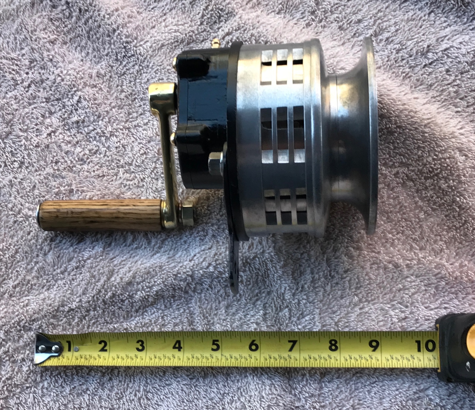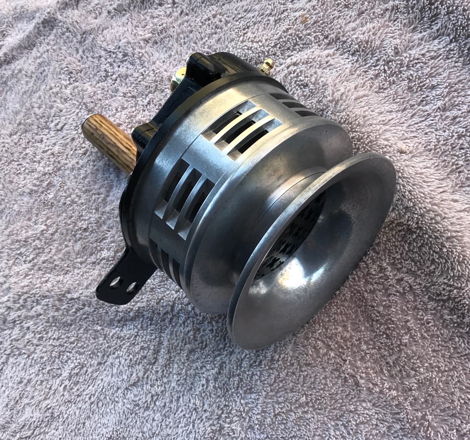 Here is a neat smaller vintage hand crank police or fire siren. It is very well made, heavy aluminum castings with steel reduction gears. Brass crank with oak handle. Works perfect, smooth, and puts out a loud wail. Perfect for that T owner that likes to make a scene. 9 inches from handle to front of bell. Bell is 4.75 diameter. 425 includes shipping.