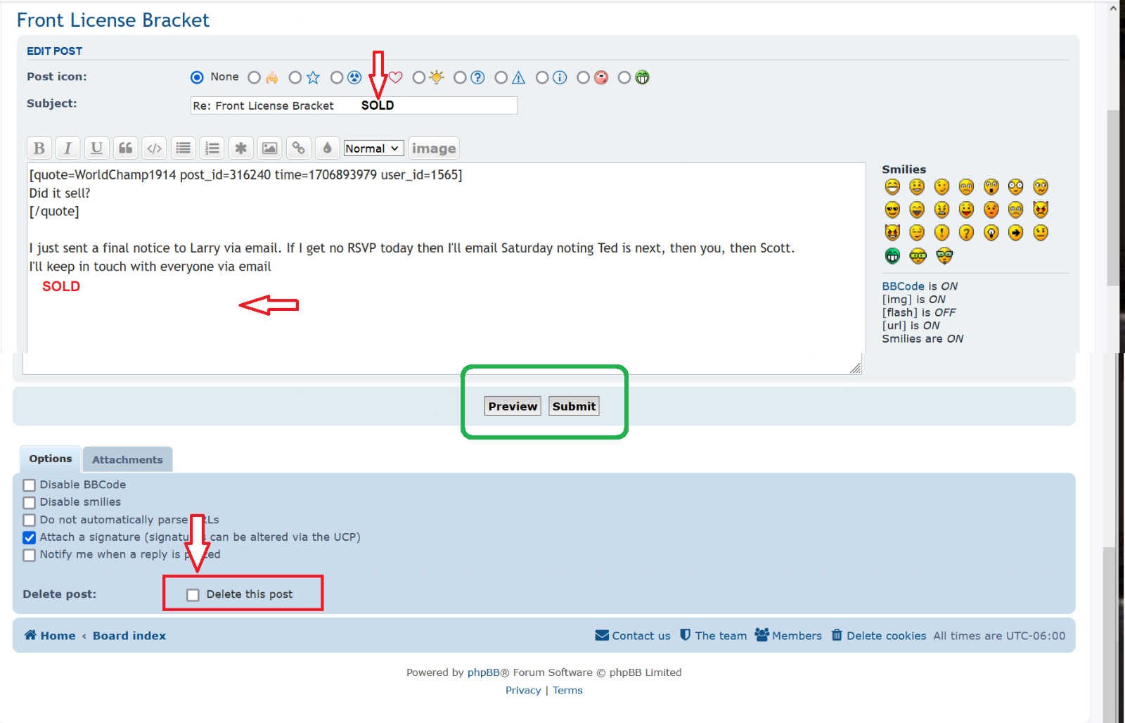 Now you have options to DELETE or correct text - when done you can view by clicking on PREVIEW and when satisfied clicking on SUBMIT. This method does not cause the specific posting to go to the top of the classified list by retains it in its current position. This helps to keep the top of the list clean with new entries