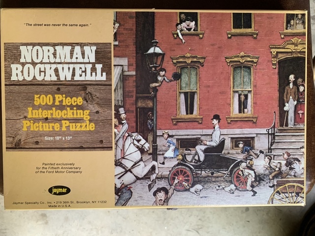 Here is another Rockwell print puzzle. This one is “The Street was Never the Same Again.” It is also from the 50 year prints he did from Ford in1953. It had been opened and I am not sure if all there, but I think they are. You will know when you put it together. $20 + shipping. Email me at address in pictures. Thanks Dan