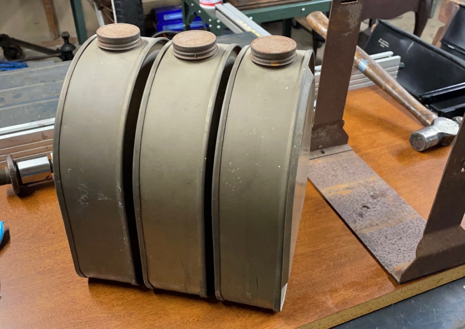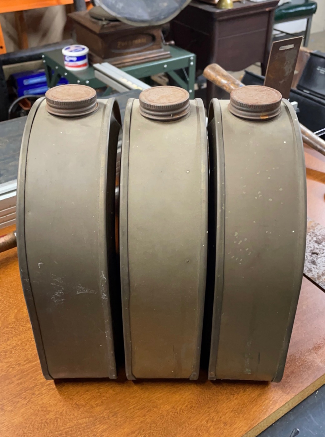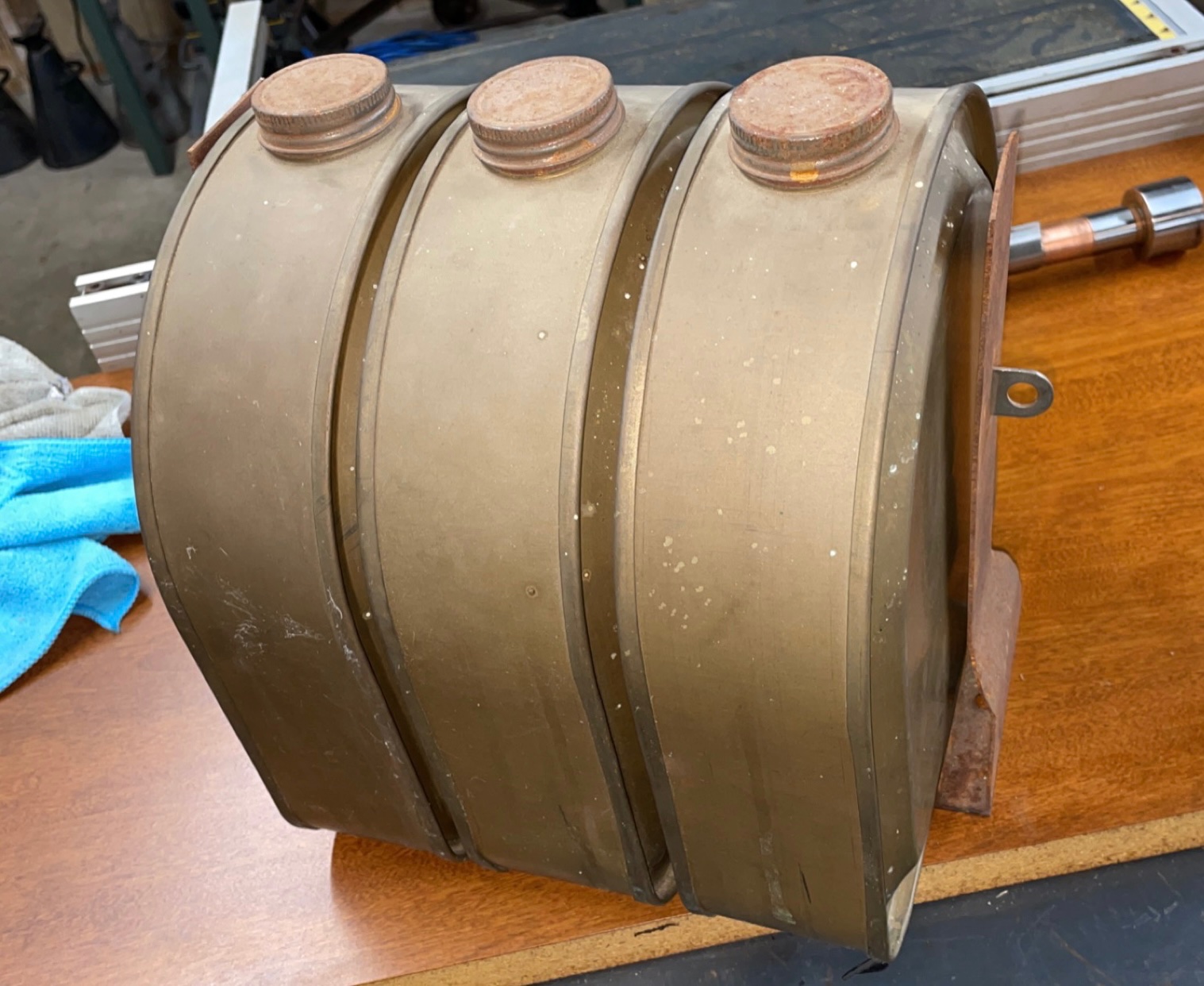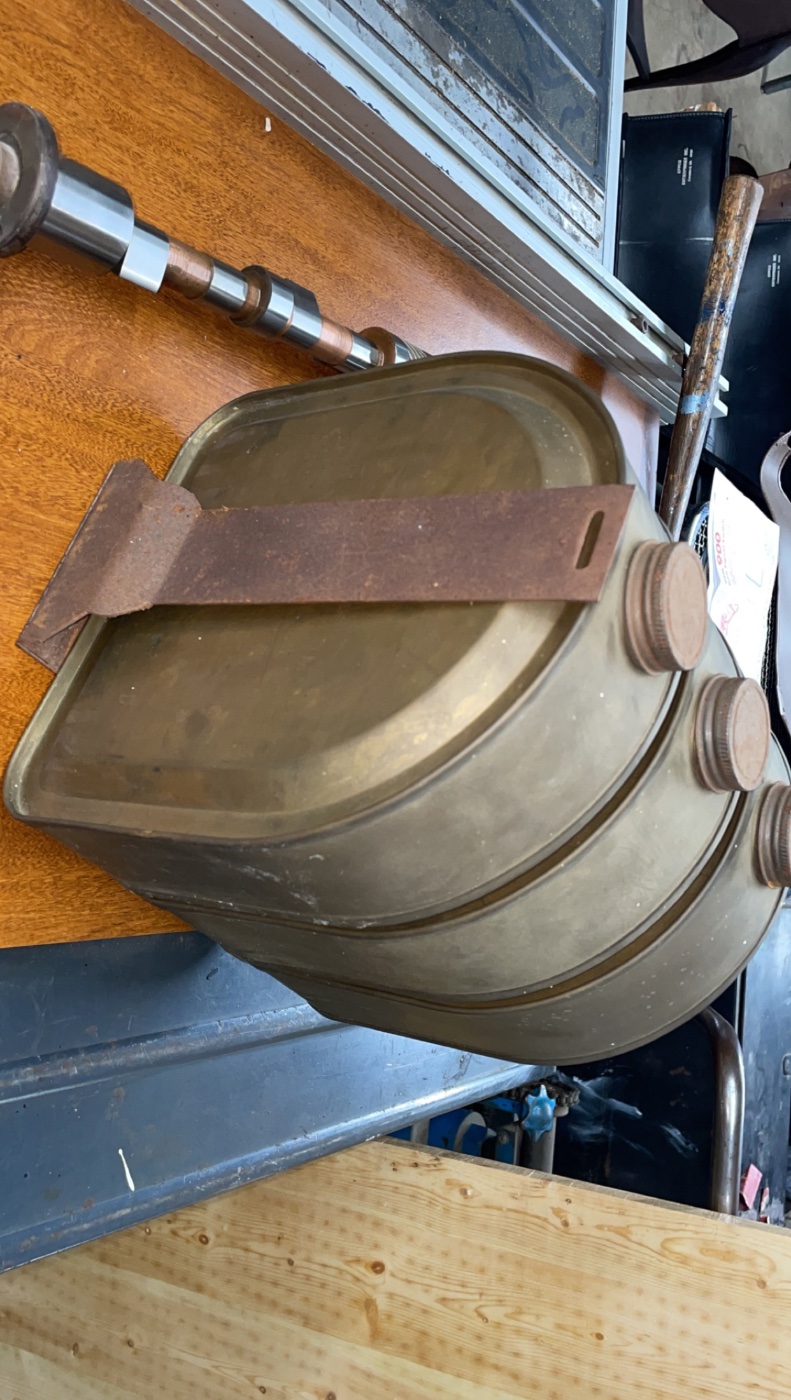 Here is a set of never used, older reproduction Boyco cans, made of Brass! Carrier is missing the top that holds the cans in place by the caps. Easily made to your liking. The cans look as though they must be soldered and pressure tested before using. These are hard to find and no longer reproduced.