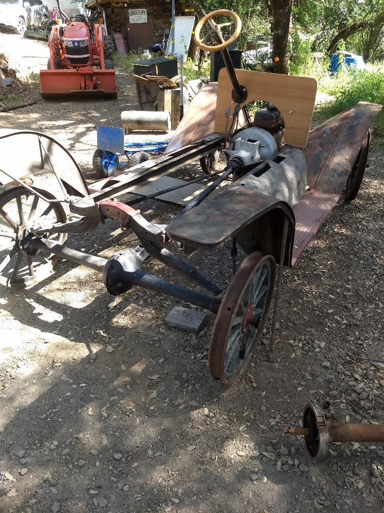 Rear end has correct strait axels with hubs that are pinned on. , Also found nice original 1909 gas tank, (shown in photo). Outlet is on the outside edge of the tank. Also have hogshead cover.