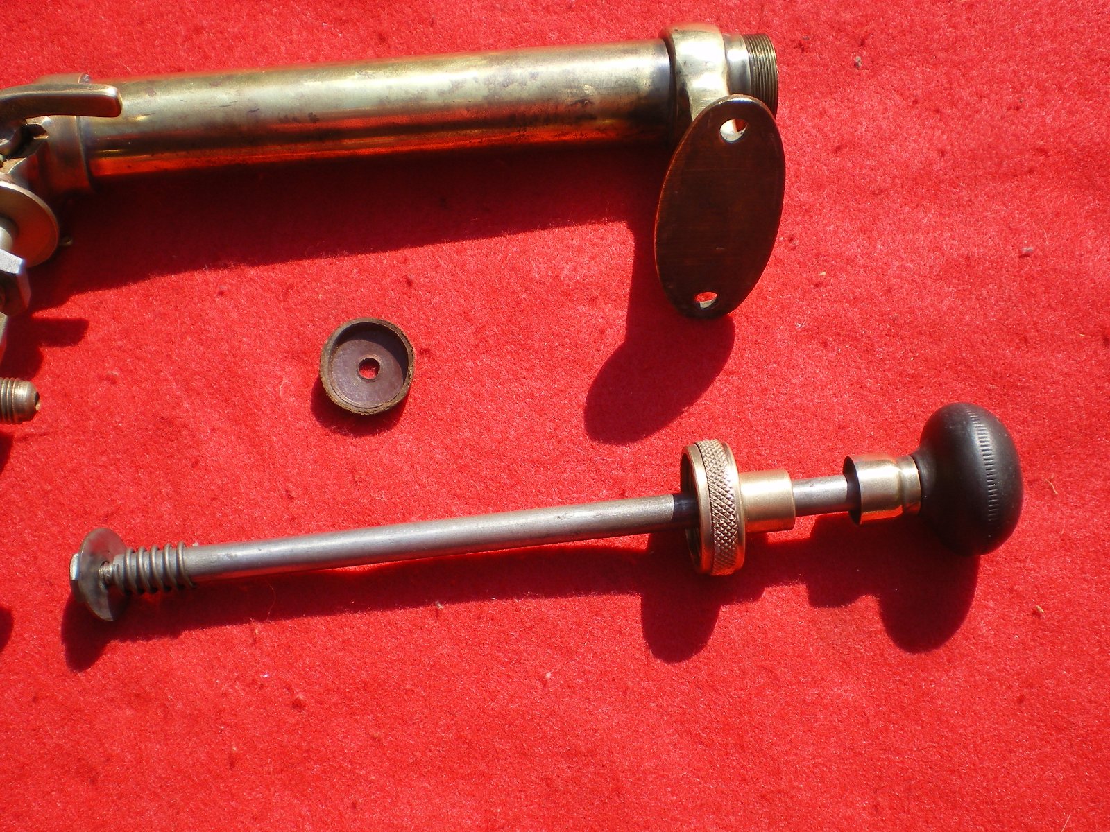 For Sale Brass hand operated fuel pressure pump. Great for brass speedster. Pump has a front port for an optional pressure gauge, currently has a threaded plug. Pump measures 10-1/2 inches in total length (Front plug to end of handle) and 1-inch in diameter tube. Shutoff valve operates smoothly. Comes with NOS leather cup (dry). Cup will need to be soaked in neatsfoot, regular or synthetic oil before installation. Not sure which oil is best. All threads are in good shape. Price $475. plus shipping. Call or text (248) 894-75fiveone. Thanks, Walt
