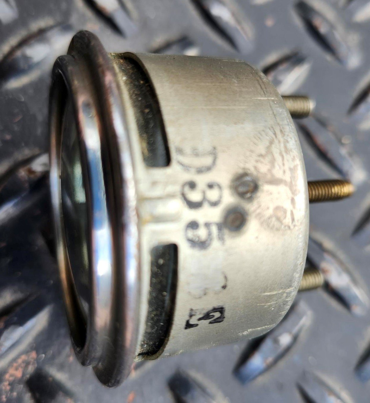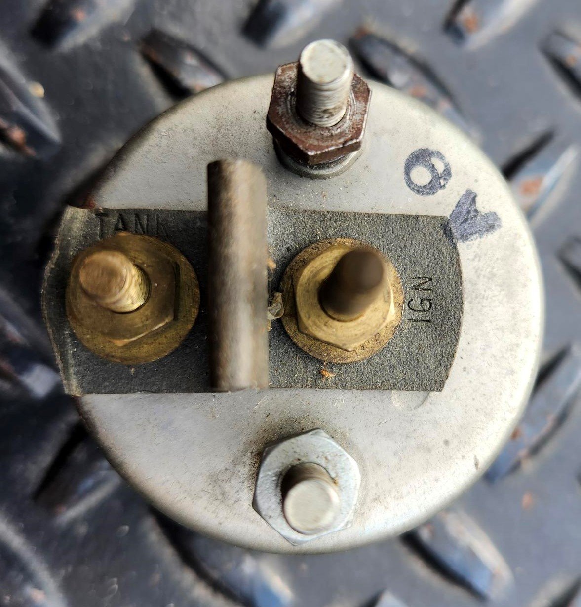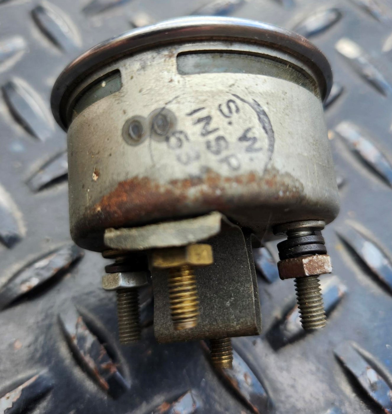 Here is a Stewart Warner Fuel Gauge. It is about 2 1/4" in diameter and has a curved lens. It is marked D358(?)E on the side, the other side is stamped S.W. INSP 53 and the back is stamped 6V. It looks great and might even be NOS. The lens has some dirt.