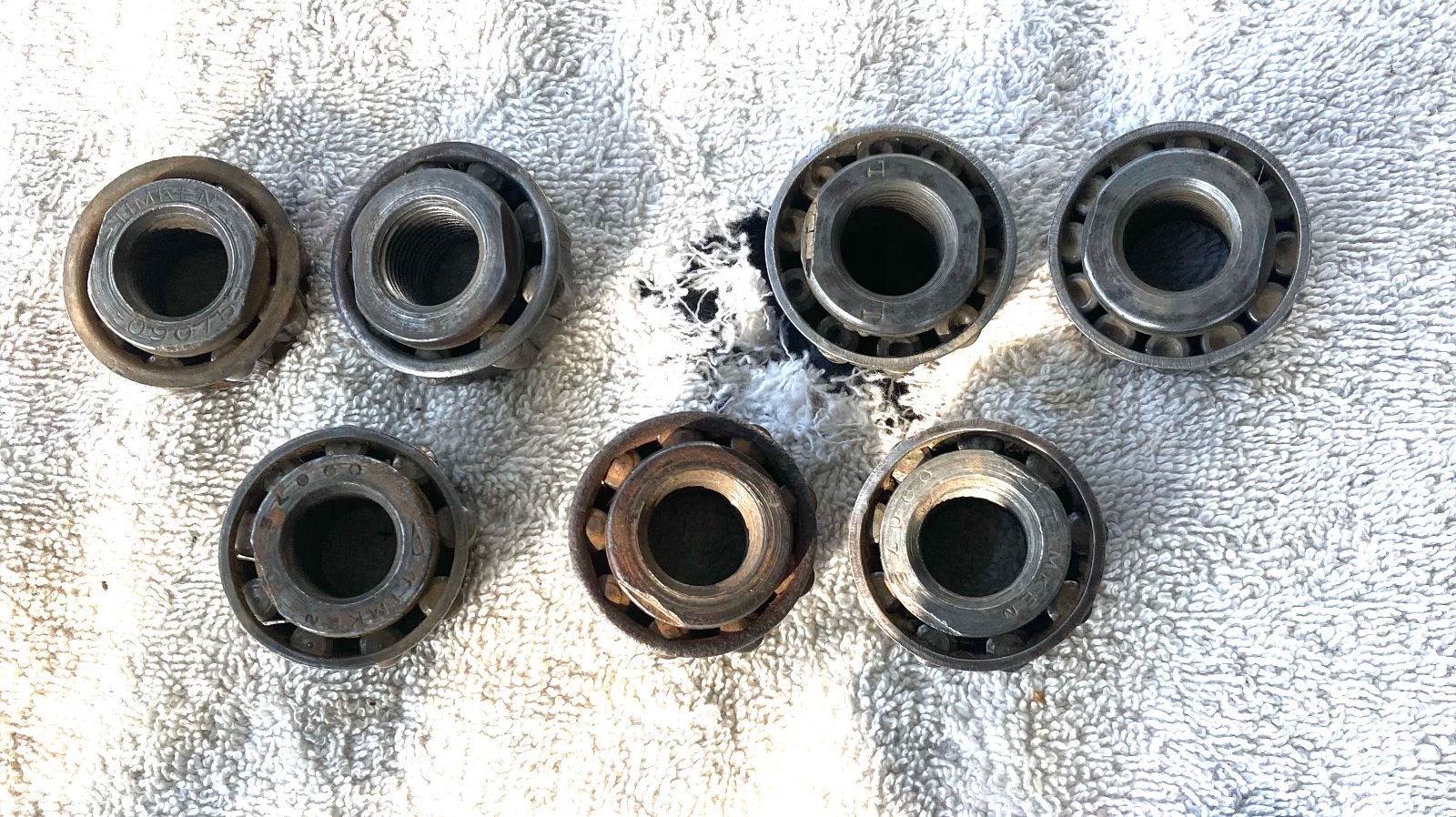 Used. Superficial rust while on the shelf. Washed in gasoline. No bench wire brush or sandblast. Upper left, lower left and lower right Timkin 09075. Rest no markings.