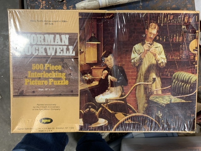 Here is another Rockwell puzzle made from a different Ford 50th Anniversary print. This one is showing Henry in his workshop building his first car. It is unopened so it is NOS. Not sure when it was made, but no bar code. $35 + shipping. Email me at address in pictures. Thanks Dan.