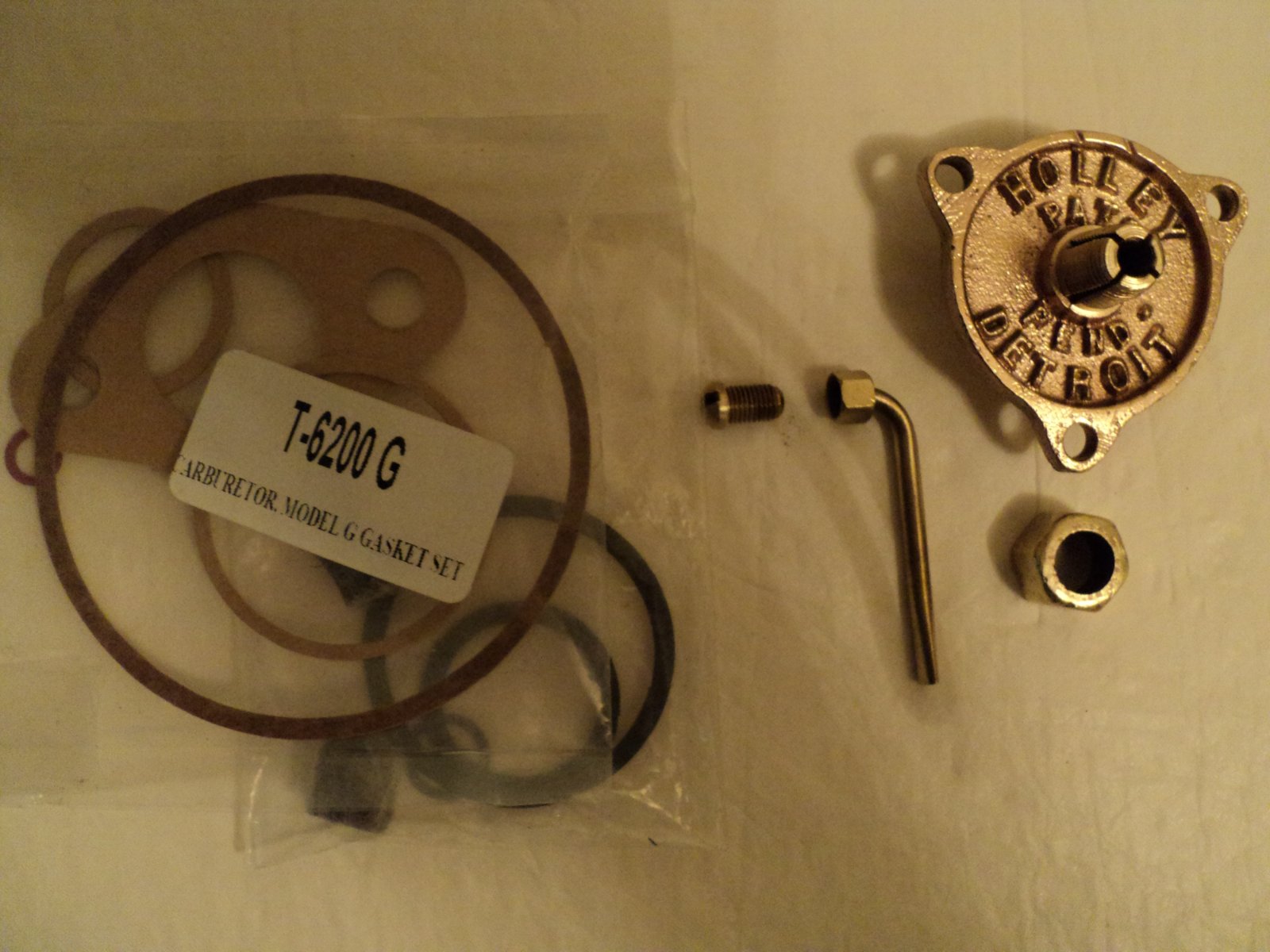 What we have here is some left over parts from rebuilding Holley G carbs and since I have sold all the G's that I have, plus won't be buying anymore, I thought for sure that someone could use these parts: the allusive strangling tube that always seems to be robbed out of cores, plus the "set" screw that the tube is attached to that a lot of times you can destroy trying to get them out to clean inside the jet area. also a brass Pat. Pend. top of the carb, along with the clamping nut for the spray needle - 4 parts that none of the vendors sell new, and lastly a new/never used complete G gasket set, and a couple of additional gaskets. Asking $25 plus $10 shipping to any of the lower 48 contiguous states only. Paypal preferred, using the Family and Friends option or a check will work too. If interested, I will provide needed info for payment. Thanks for looking!!! Walt Wise