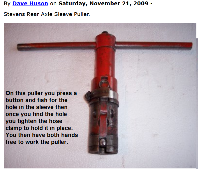 The Stevens rear axle sleeve puller is hollow in the center, so it can be used with the axle shafts still in place.