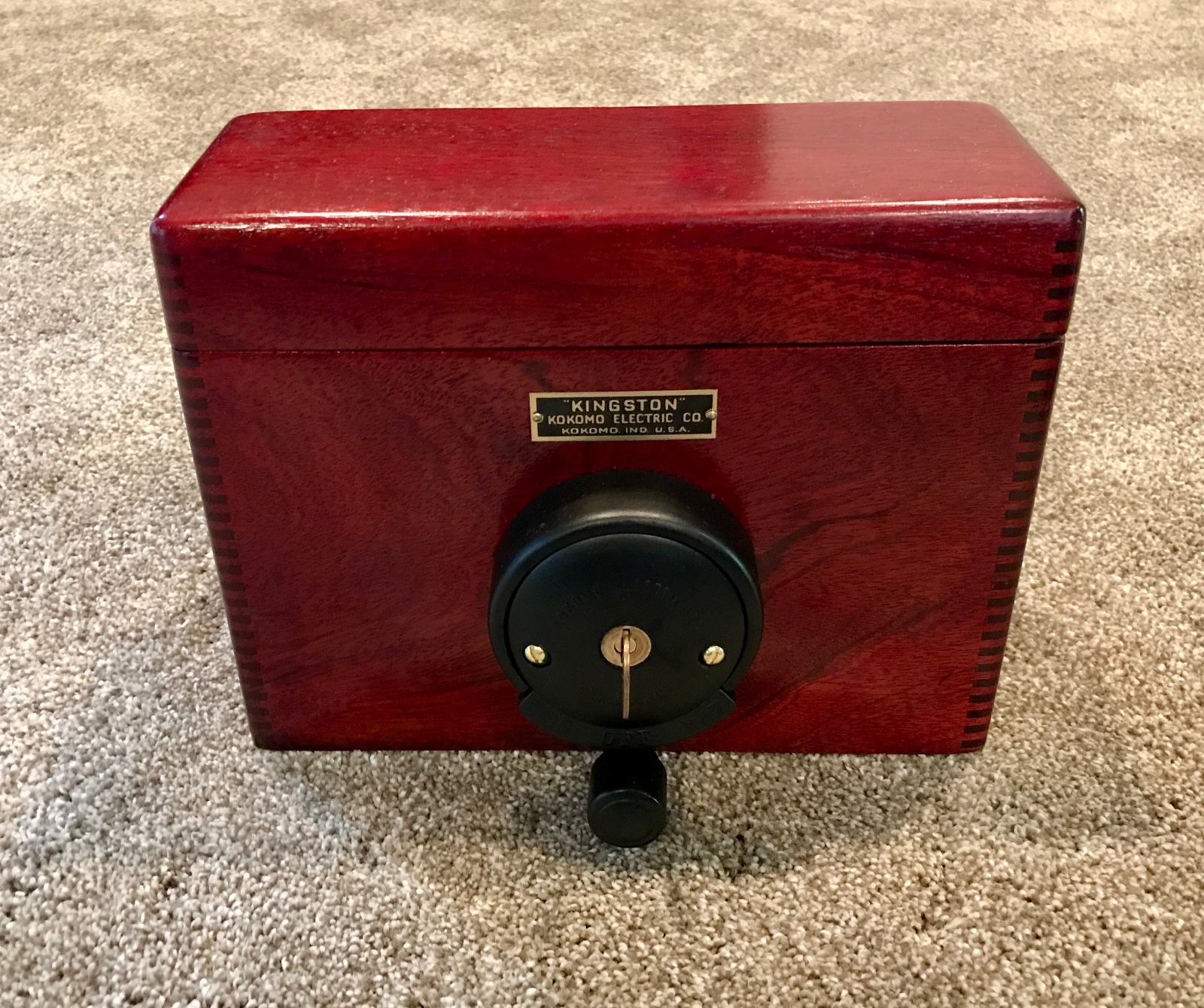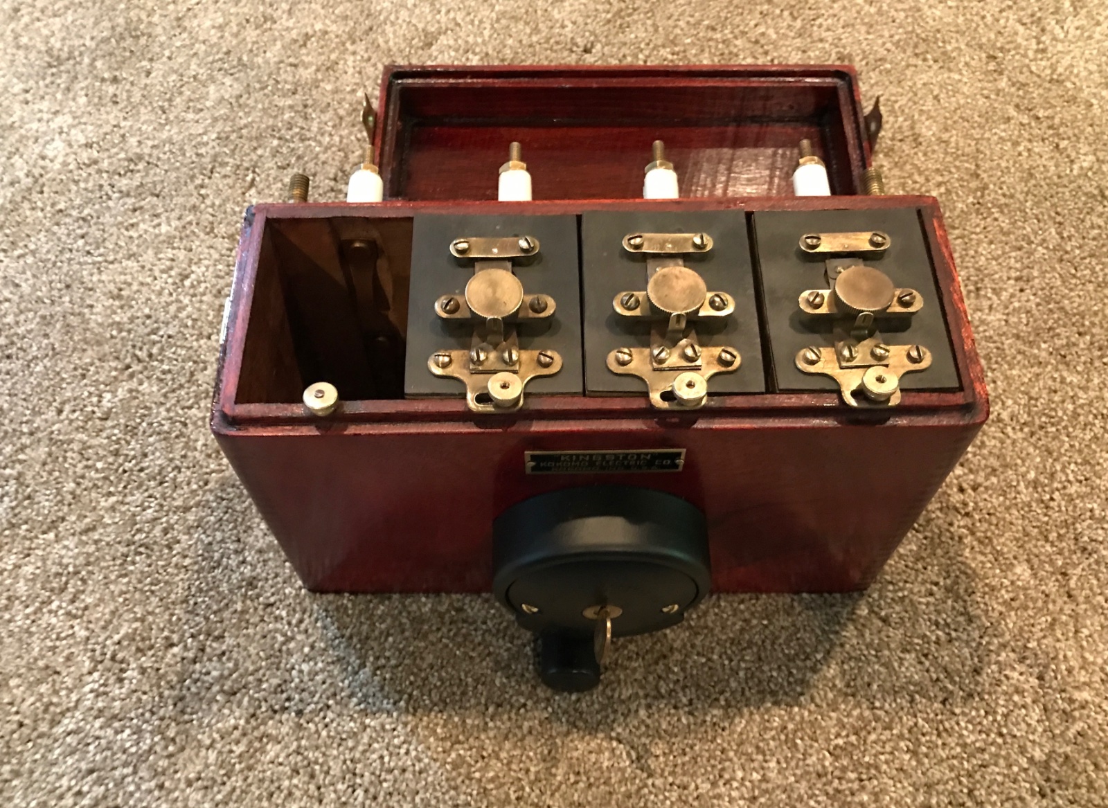 Original 1911-12 Kingston Coil Box. Very nice original serial numbered box with matching number body and lid. Original switch. Includes 3 correct Kingston offset contact coils. Includes original Kingston key. Box has been cosmetically restored, with correct cherry stain, leaving wood grain texture exposed. The contacts are all in nice shape, and the solid core wiring is intact. The switch is nice and solid, works good, with correct internal contacts and knob. Coils are complete with all hardware but are untested, and condition unknown. Hard to find complete coilbox. 650.00 includes shipping lower 48.