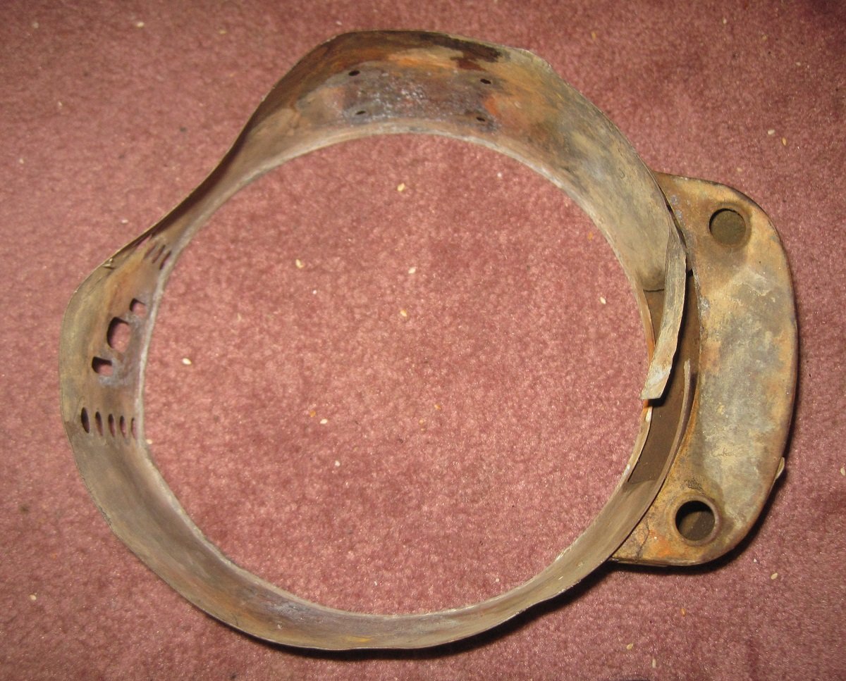 Free: one smoke bonnet and brass body from a fairly large (8" diameter") head light from the brass era. I'm guessing this lamp is ca. 1906-1912, probably pre-1910. The smoke bonnet is really the only salvageable part here, and even so, it has a dent in it which will have to be taken out. I don't know much else about this. It's yours just pay shipping.