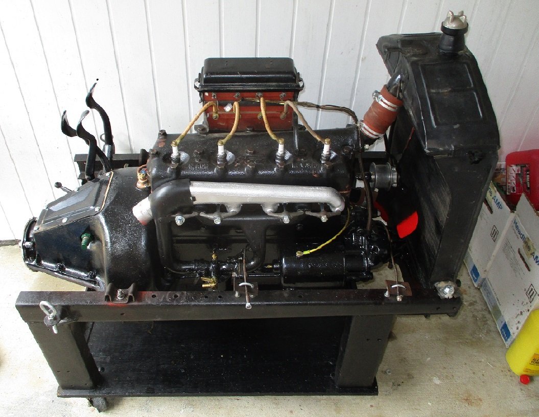 The engine test stand is also for sale for $1,500 if the engine sells first. This stand was built about 45 years ago by “Shorty” Grapes in West Virgina and sold to me after his heart attack put him out of business. I have taken good care of it and used it often, but now plan to retire and not need it. The radiator was New Old Stock in 1984 and went cross country and back on that tour. There was a mishap a few years ago that took out three tubes, but it does not leak and works fine on the test stand. The Timer and Carburetor are controlled by rods on the right side. The Start button, Bat/Mag Switch, and an original Ammeter are on the left side, along with a Master Disconnect Switch on the 6 Volt Battery that sets on a shelf with four 3 inch casters below. The 1926-27 Coil Box has four rebuilt coils in it and goes with the test stand, and cannot be shipped. Owned by Jim Golden, and located in Bowie, Maryland.