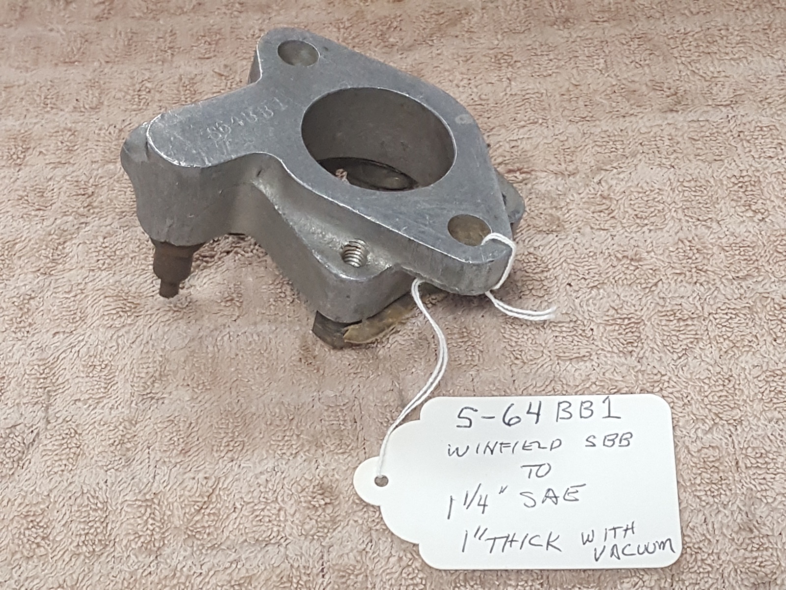 Original Winfield carburetor mount for S and SR models, has built in tap for vacuum to run vacuum tank windshield wipers gauge or whatever. Factory marked S64BB1 made for Winfield carbs size BB to fit to a manifold with 1 1/4" S.A.E. carburetor flange ( 2 bolts on 2 11/16" centers). Perfect condition $95 including domestic shipping.