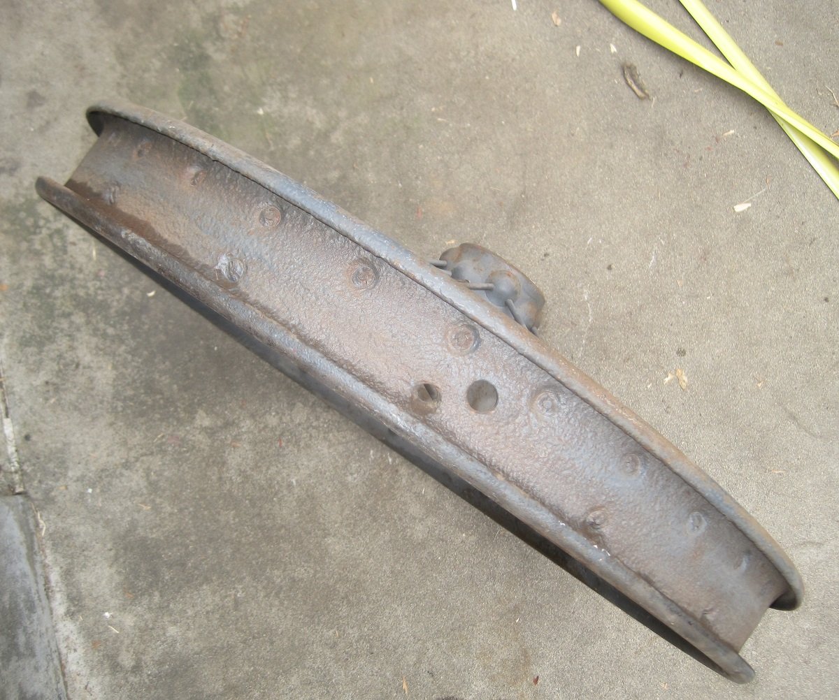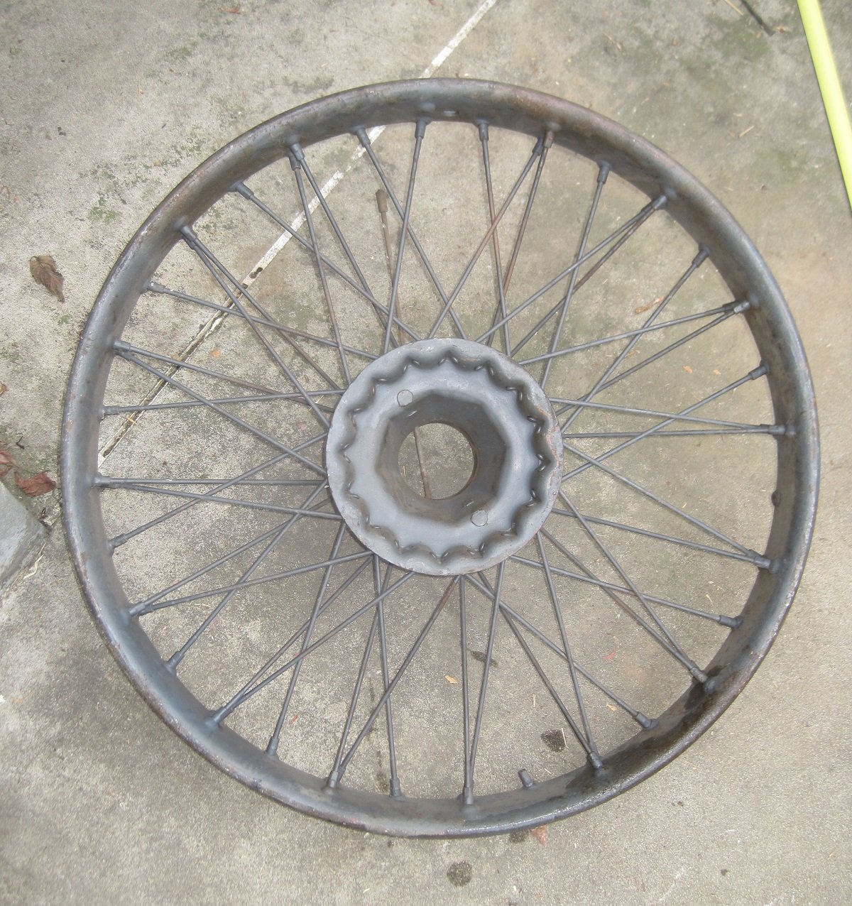 FS one BUDD wire wheel as used on Overlands ca. 1920. You sometimes see these adapted to Model T Fords. Selling just the wheel, no hub. The OD of the wheel is 24" at the very edges and 23" where the inside diameter of the tire meets the rim. Usable condition, there are a couple of bad spokes. Asking $115, shipping not included.