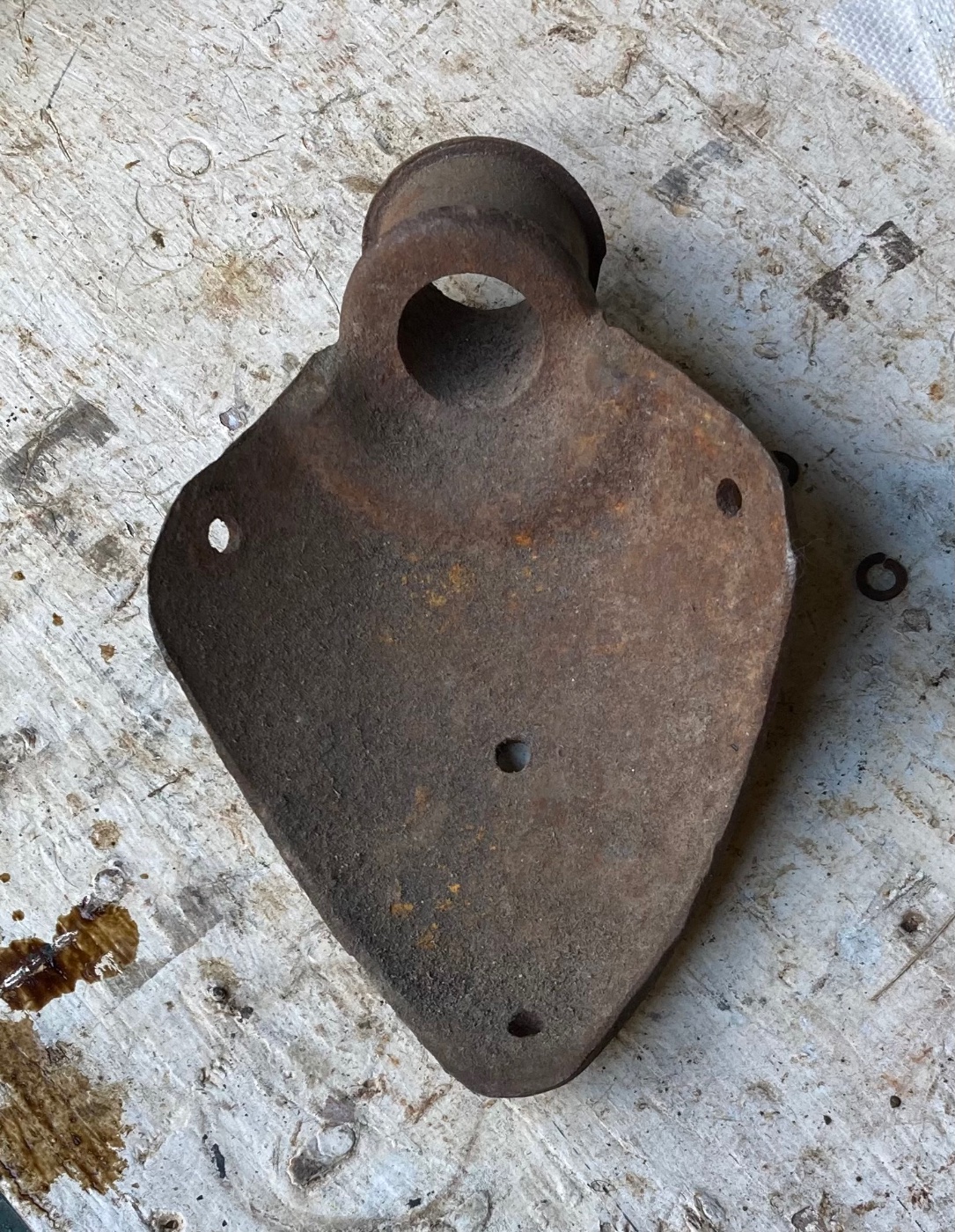 Probably of the 20’s to end of production. Cast iron and can see no evidence of ever being riveted or ever having crank bushing… NOS ?…light superficial rust. Can send to Mark Chaffin for sandblasting. No pitting.