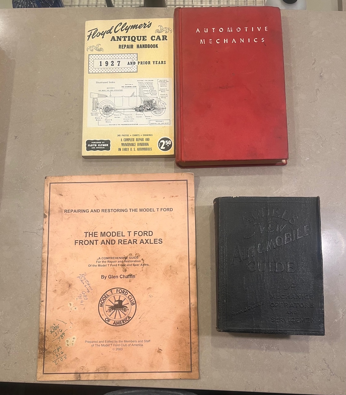 Floyd climbers, antique car repair manual, automotive mechanics, Audel‘s new automobile guide, model T Ford, front and rear axles manual. All $10 each plus shipping. kdmks AT att.net.