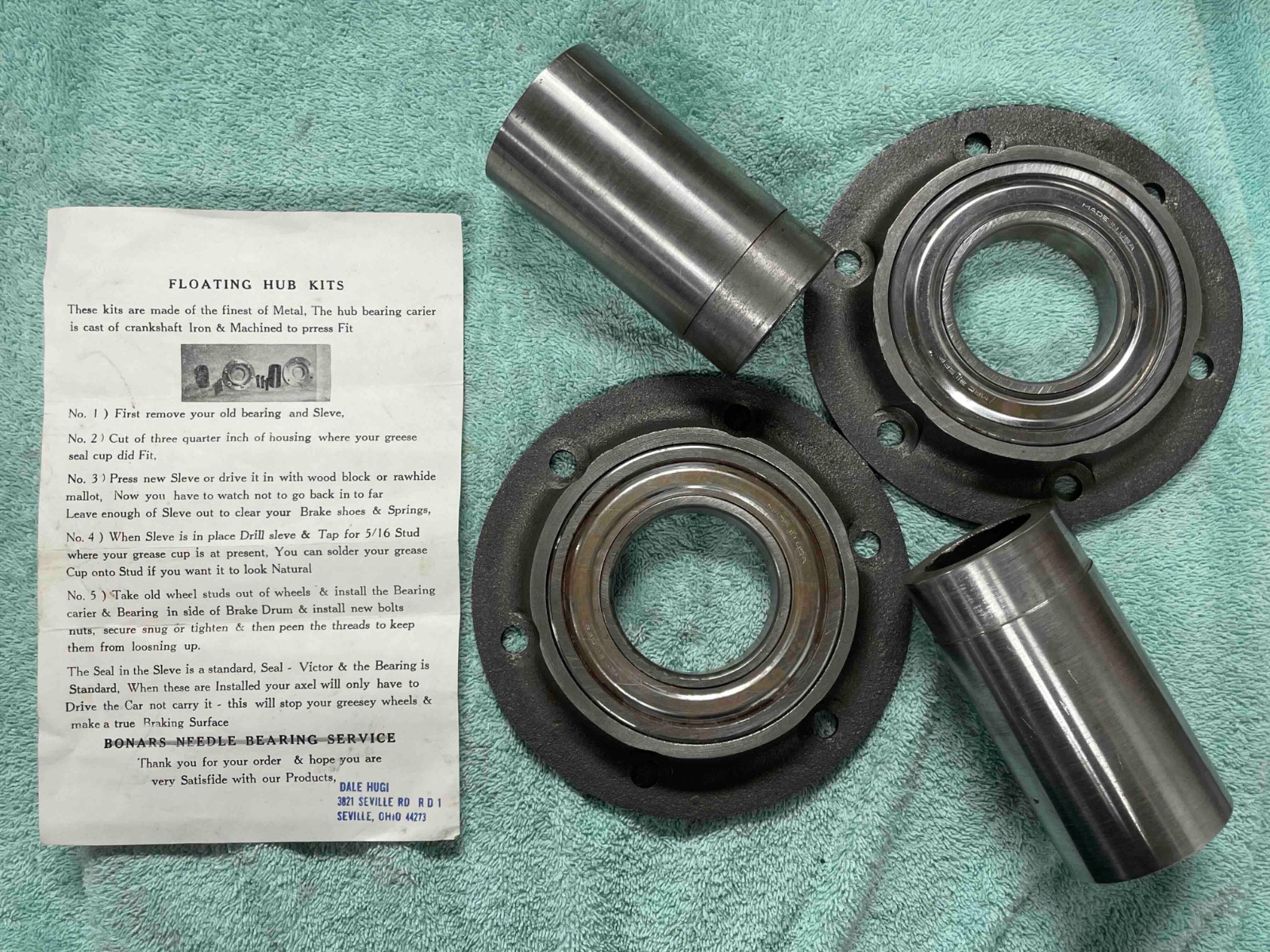 This new never installed kit replaces the Hyatt outer roller rear axle bearing with a sealed large ball bearing. It also provides a modern seal on the axle shaft to stop differential lube from leaking onto the brakes. This kit does both left and right rear axles. The bearing mounts have 6 holes so are intended for wood wheels ( that includes accessory wire and disc wheels that use standard 6 bolt pattern drums). If you are using 1926-27 Ford wire wheels with 5 bolts, the bearing mounts could be re-drilled to that pattern. Only this one set so when gone there will be no other available here.
