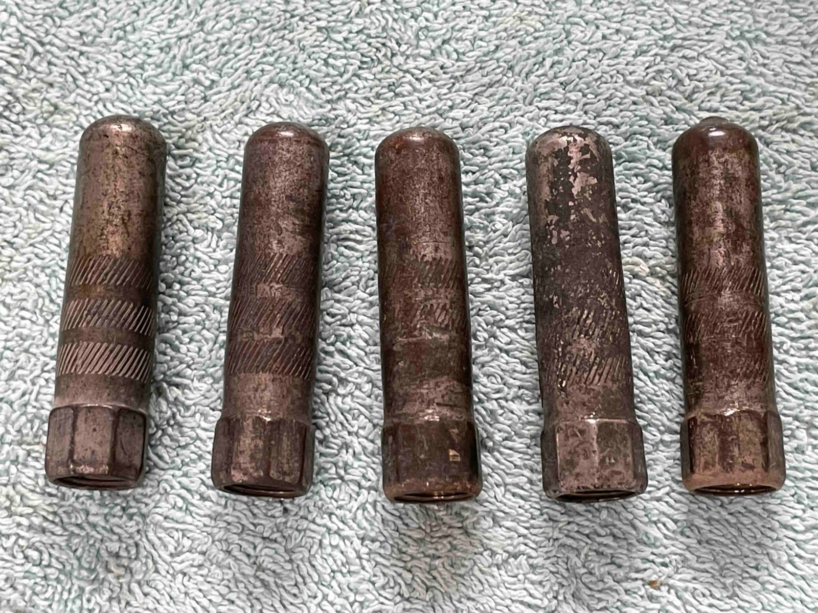 Set of 5 matching tire tube stem dust covers for metal stem tubes, original nickel plating that can be stripped to bare brass,