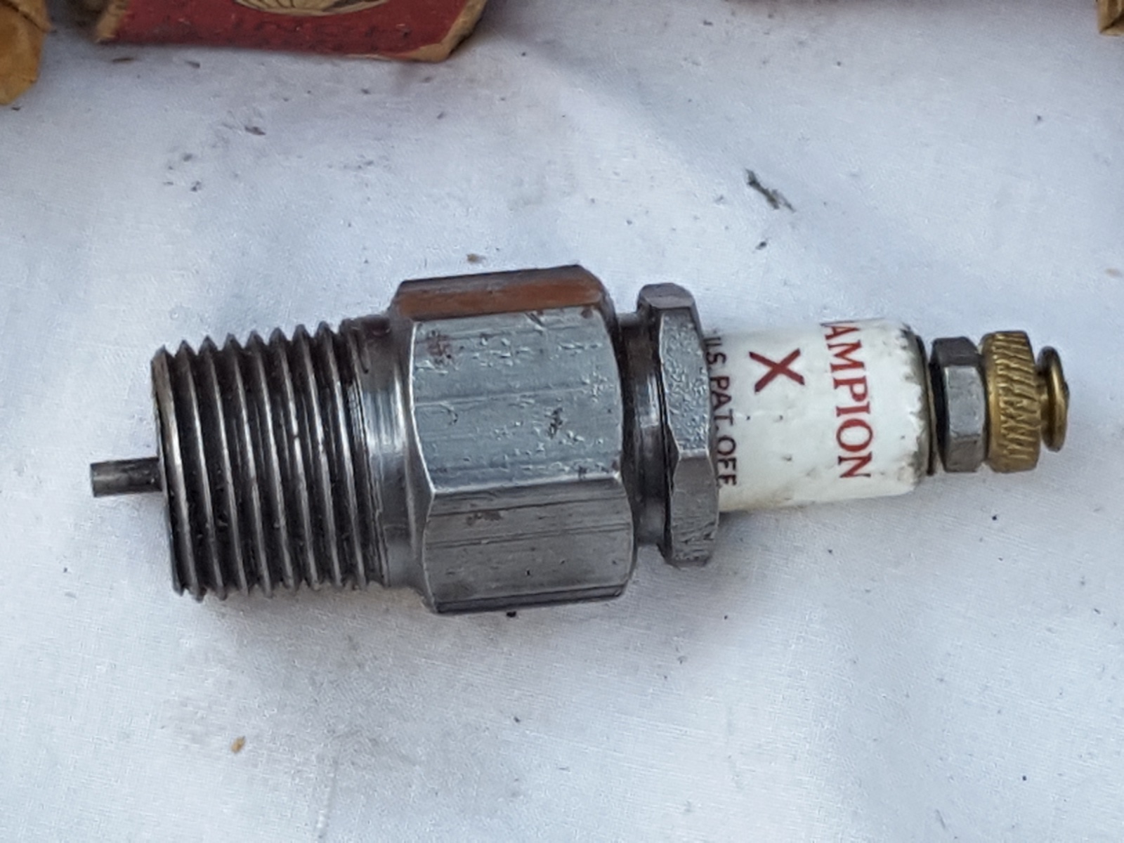 5 NOS very early Champion X spark plugs with tatty boxes, believe these predate brass top plugs,