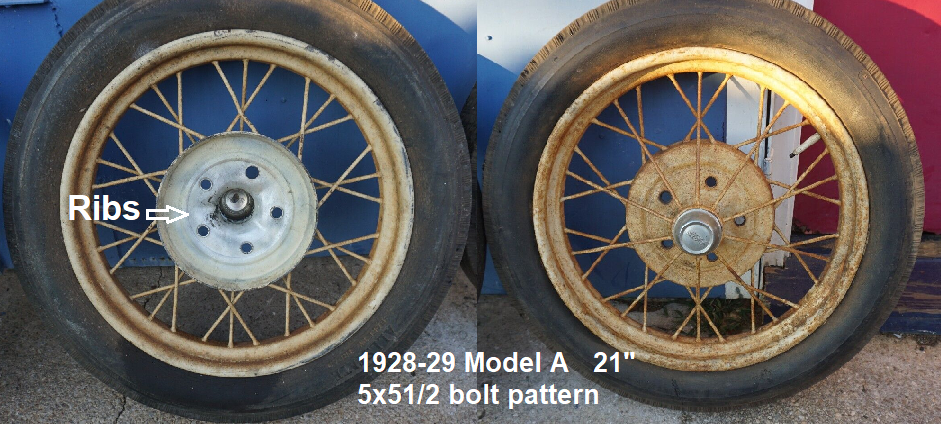 The were two styles of 21" Model A wire wheels. Early 1928 were the "AR" style and then for 1928 & 1928 the ribbed styleMelba Nolan wrote: ↑Fri Nov 29, 2024 11:06 amok is that how you tell a T from an A by the size of the center hole?