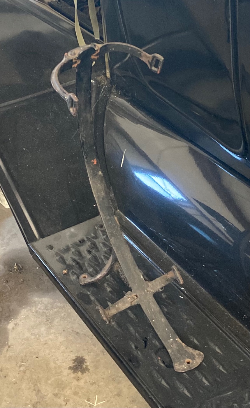 …..Spare Tire Carrier. Never seen another like it. Requires 3 holes in runningboard. Carry your 3” and 3 1/2” tires. Only need 2 leather straps from Russ. Free delivery to Duncan Swap Meet in March….See Milwaukee misspelled in last picture. Only $350 gwhouse731(at)gmail(dot)com