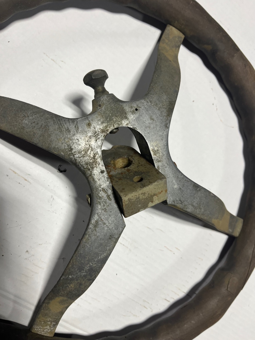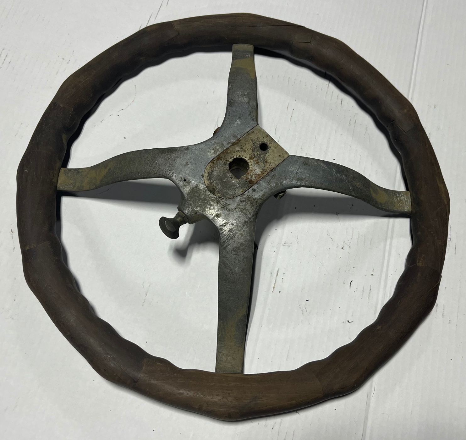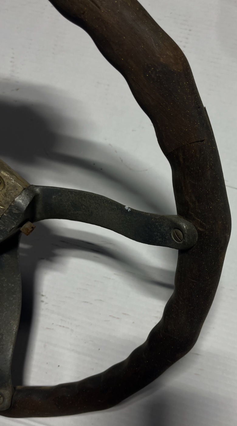 Bauer Accessory Fatmans Steering Wheel. Release pin and swivel works as designed. Wood rim has some cracking as seen in photos. Manufacturers tag is missing. $275.00 plus shipping. Lang’s 1-800-872-7871
