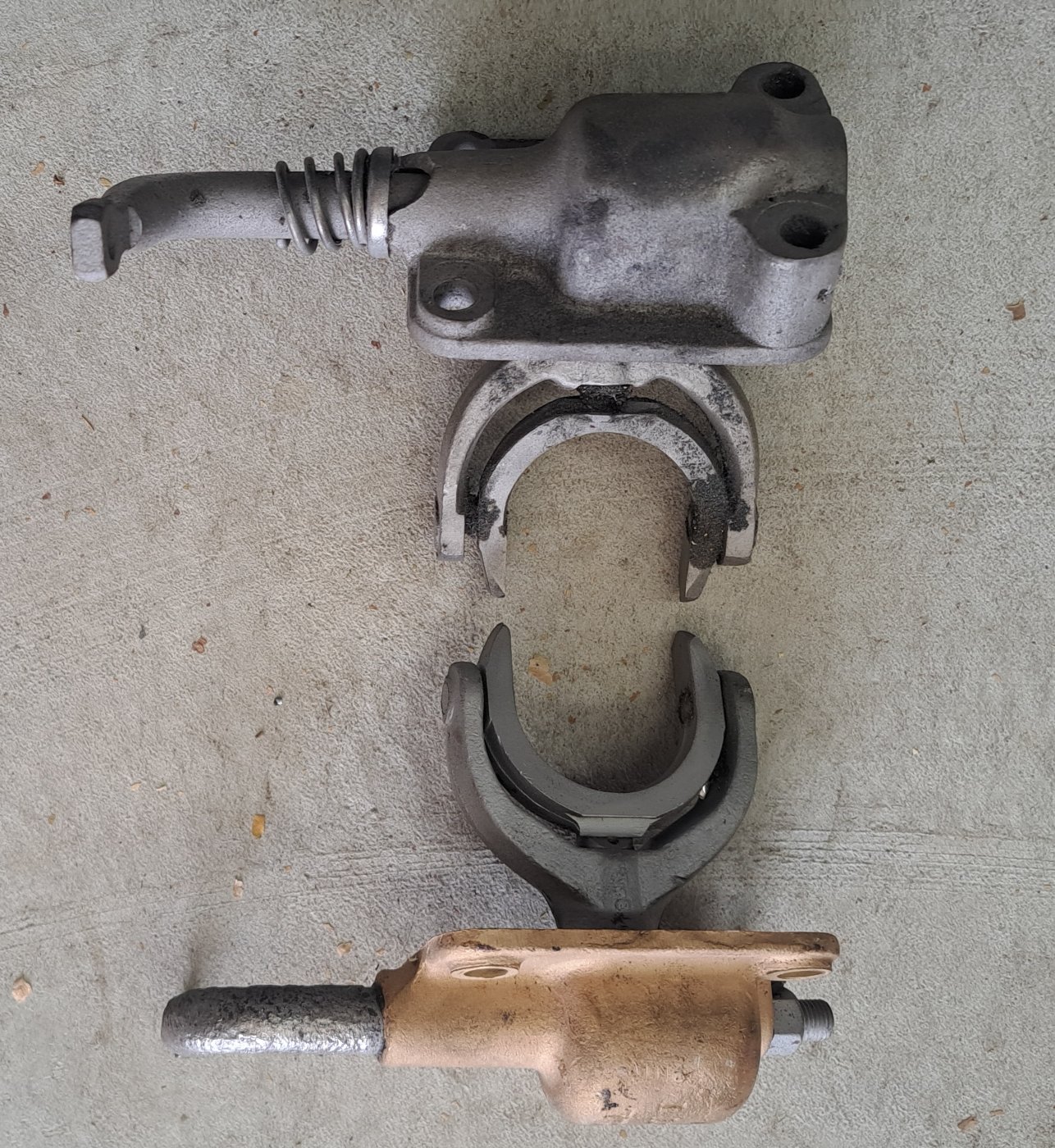 One early brass Hall Scott assembly. Arm will need repair where the shift rod attaches due to wear. One later cast iron bodied shifter assembly with damage to the body where the arm enters. Easy repair. Take your pick WAS $75 NOW $60 each plus domestic shipping. Mark Chaffin (951)805-0928