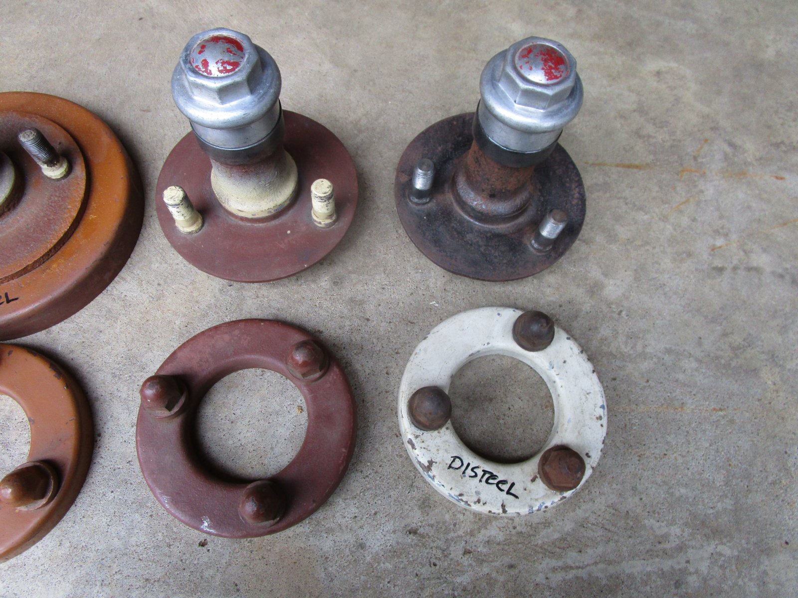 I have for sale a pair of front Disteel front hubs and a pair of Disteel rear hubs with rings and hubcaps. The front hubs are in good shape and other than a good cleanup are useable as-is. The wheel bearing races look good, and I would use them, but I'll leave that up to the buyer. The races are tight in the hubs. The two rear hubs have a few issues. The caramel colored one looks good and has a useable-looking taper and keyway but 2 of the stud bolts have a lot of rusting to the shank of the bolt. That is common on Disteel hubs as the lug nuts tend to hold moisture. The black hub has decent looking stud bolts but has a very rough taper. It was on my car when I got it and it ran OK, but I replaced it several years ago. I was going to try and press out two of the black hubs stud bolts to change out the two studs in the caramel-colored hub. (I have never done that and do not know how hard it will be to do) Then I was going to use the black hub to make a spare tire carrier for my spare. I found an original Disteel spare tire carrier (scarce as hen's teeth) and never got around to using the black hub to make one.