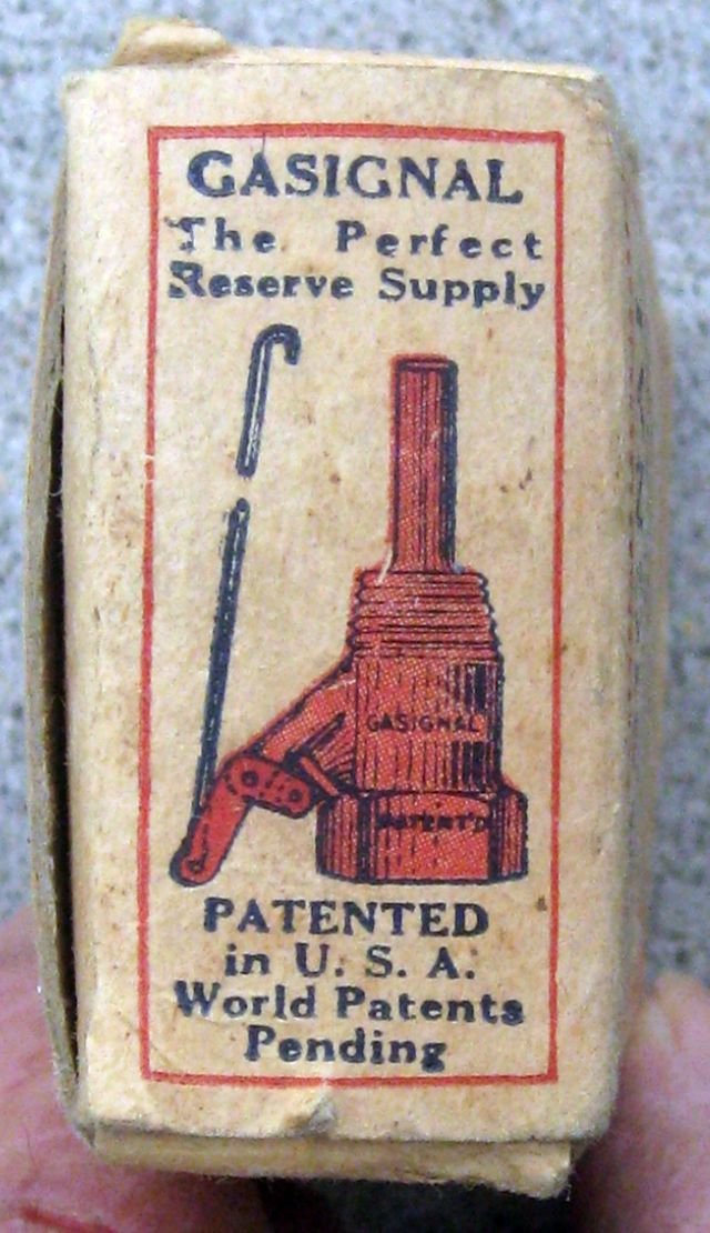 Here's a handy device that adds a stand pipe in the gas tank so when you run out of gas you pull the string and tie it off to get to the last of the gas in the tank.The one gallon of gas remaining below the stand pipe will get you on your way to a filling station. Asking $75 plus postage.