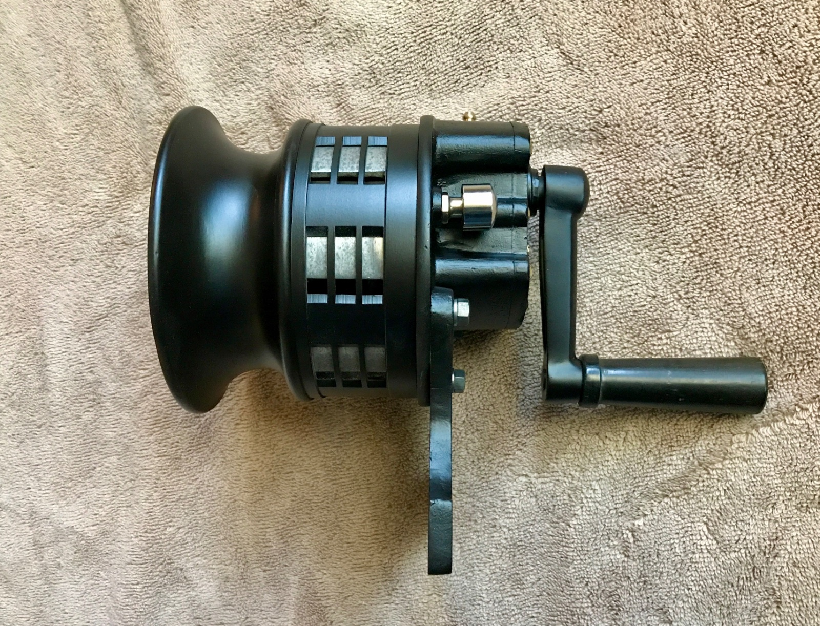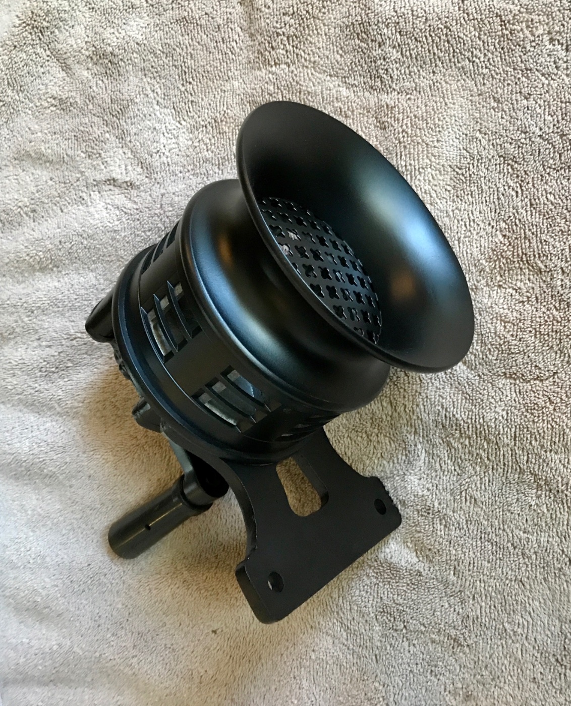 Very nice early hand crank siren. Nice paint, very clean. Well made, with steel precision internal gears. Heavy duty construction. Works great. Very loud wail. Perfect for waking up texting drivers at the intersection. Has push button brake to stop siren at will. Includes cast mounting bracket. 10 inches from handle to front of bell. Bell diameter 5.75. Ready to mount and use. 400 includes shipping.