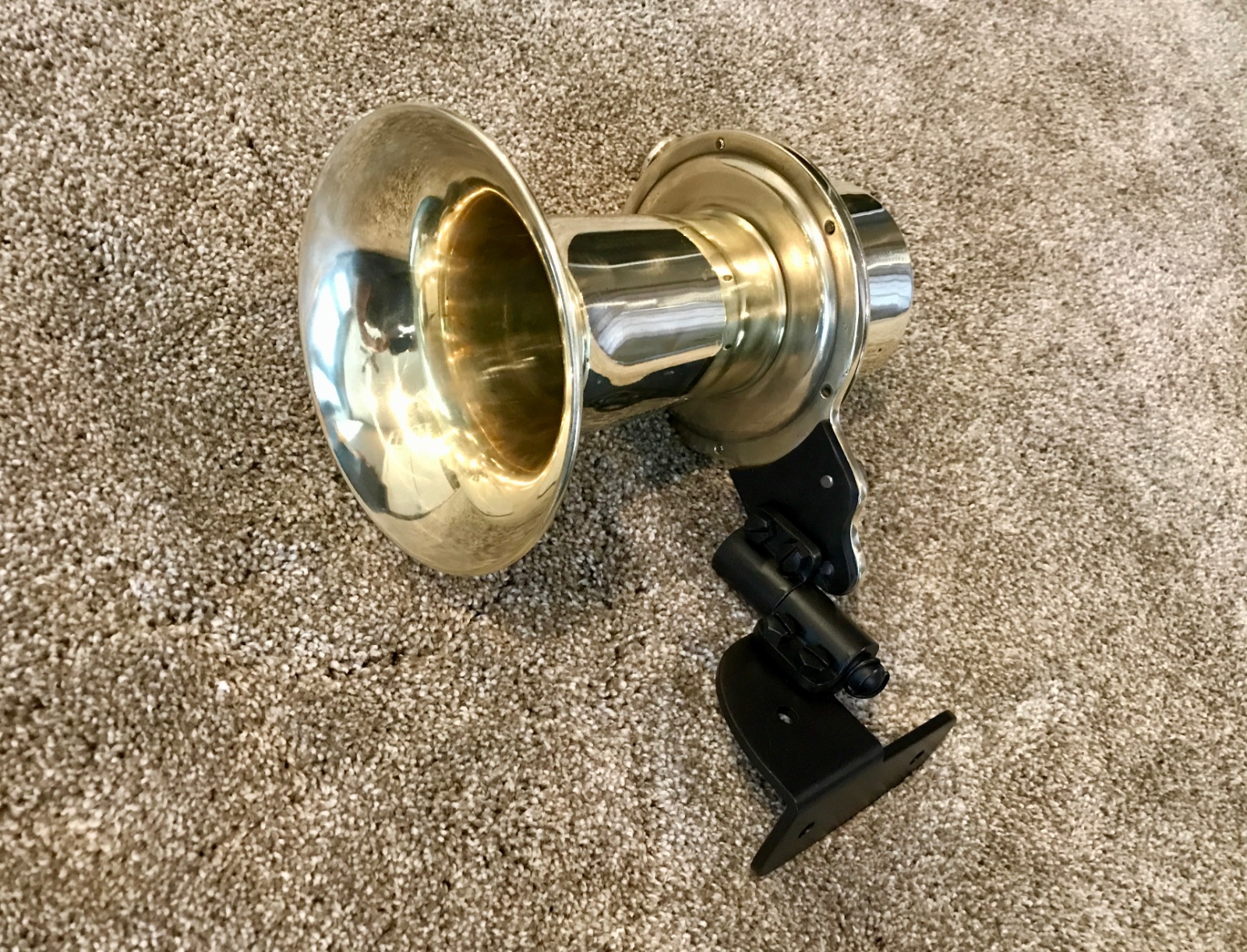 Original heavy solid brass G. Piel Company Long Horn. This is a beautiful all-brass hand operated horn. It is in great condition, no dents or cracks on bell. Weighs 7 lbs, 8.5 length, 6 inch diameter bell. It lets out a loud “AAAWHOOO!” when the plunger is pushed. The internals are very clean, lubed, and in wonderful condition, and operate as designed. It has a nice polish, with just enough age and patina evident. Very rare high-end heavy brass horn. Very expensive horn for its time. Very hard to find in all brass. Includes original pivoting mount. Very nice. 425 includes shipping.